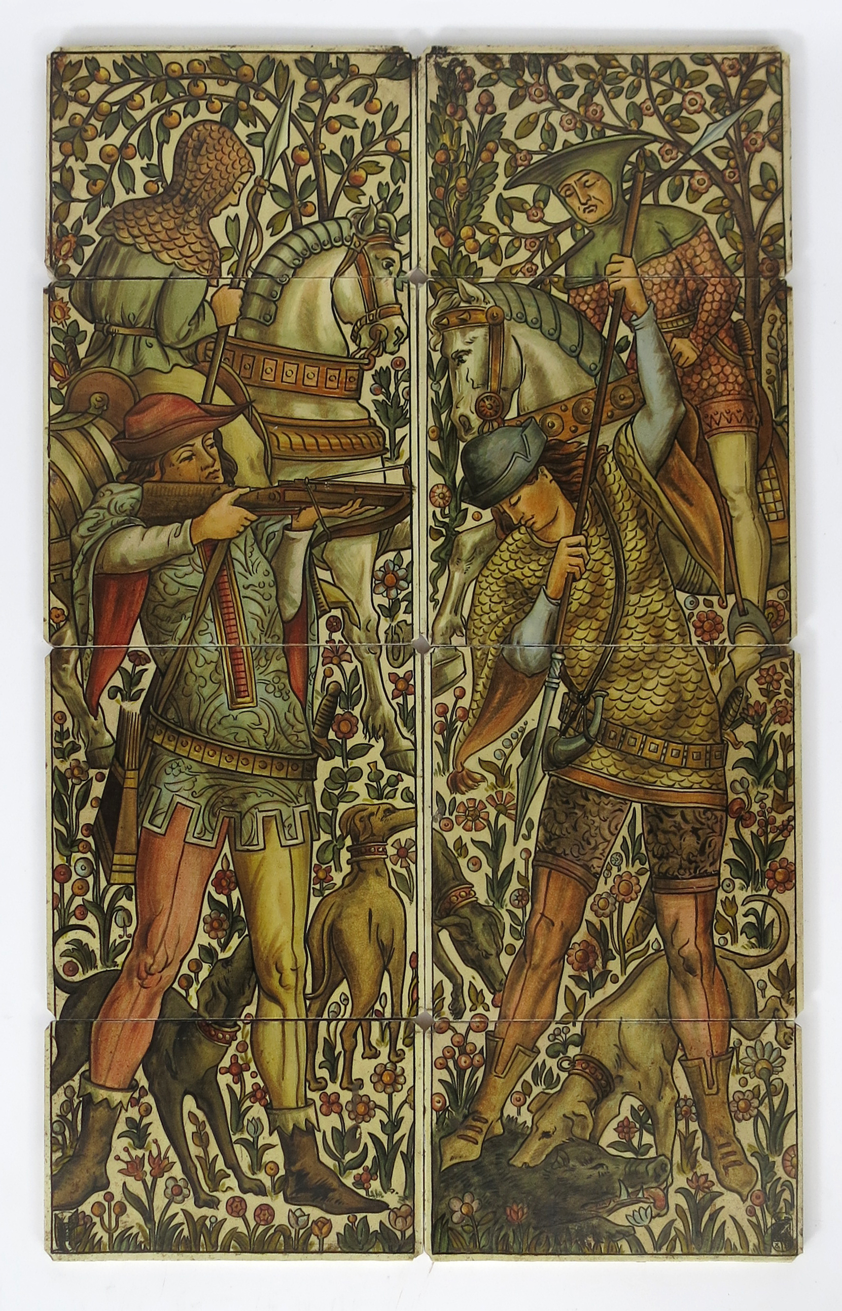 Two large Maw & Co four tile panels, each depicting a medieval hunting scene, one depicting a crossbowman and hounds, the other a man spearing a boar caught by a hound, mounted attendants behind, on a scrolling foliage ground, glazed in colours on cream, impressed marks, factory chipped corners for mounting in a fireplace, 78 x 23.5cm.