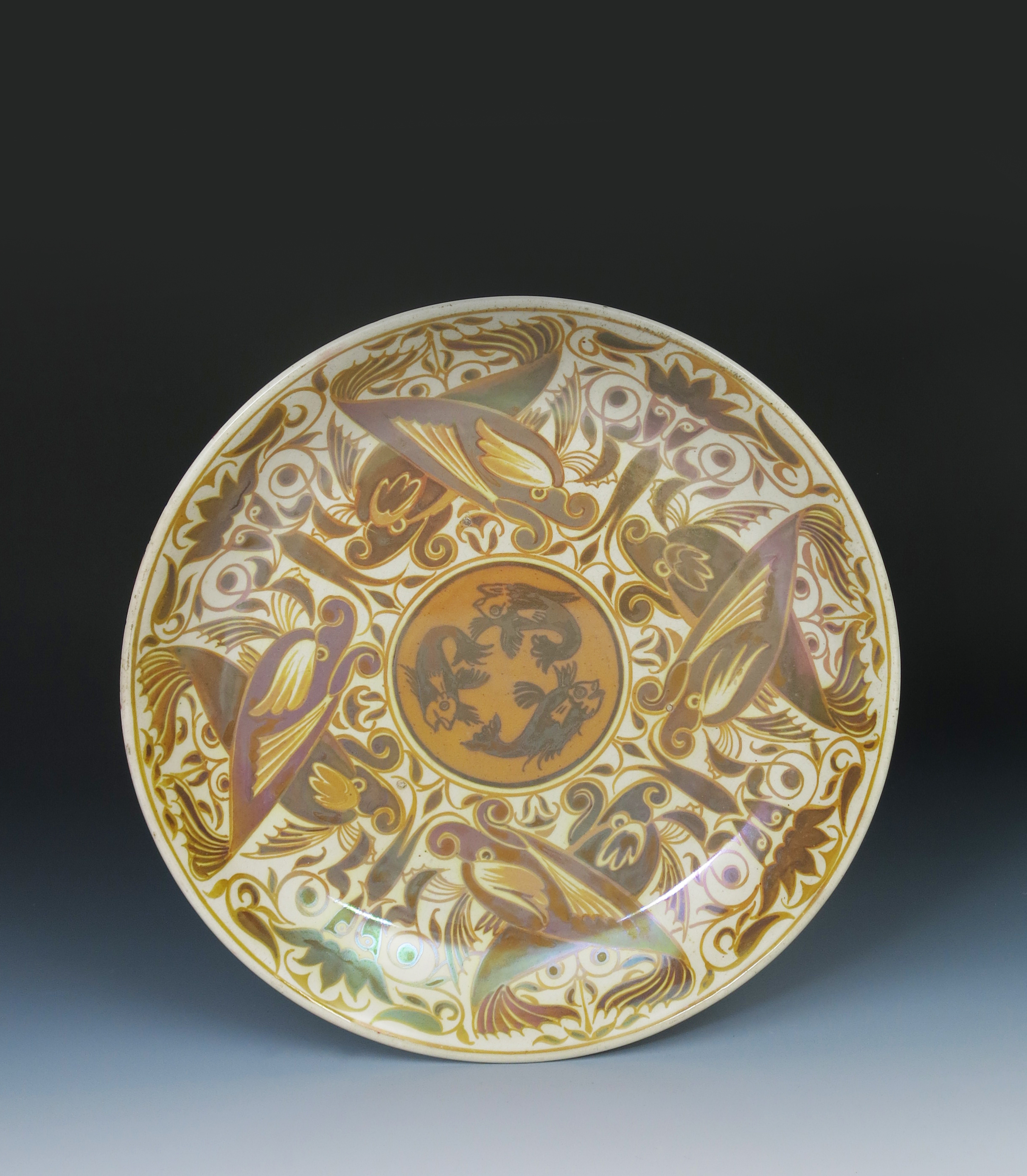 A William De Morgan lustre charger, painted to the well with three scaly fish, the border with a frieze of classical dolphins and masks, in ruby and golden lustre on a cream ground, the reverse painted with scroll rim and scale band, unsigned, 36cm. diam.