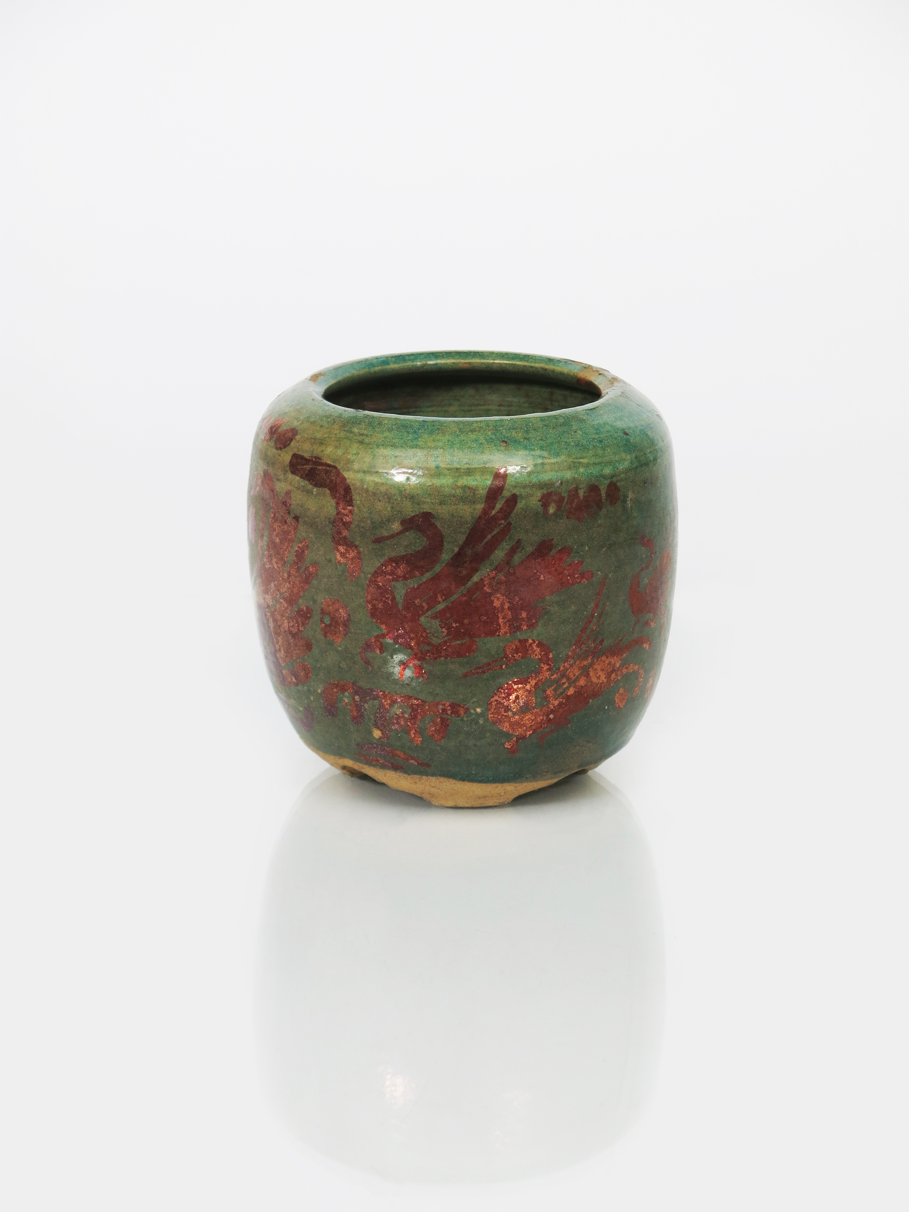 A lustre glazed pottery vase in the manner of Bushey Pottery, shouldered cylindrical form with inverted rim, on three moulded feet, decorated with mythical birds, in red lustre on a green ground, unmarked, 13cm. high