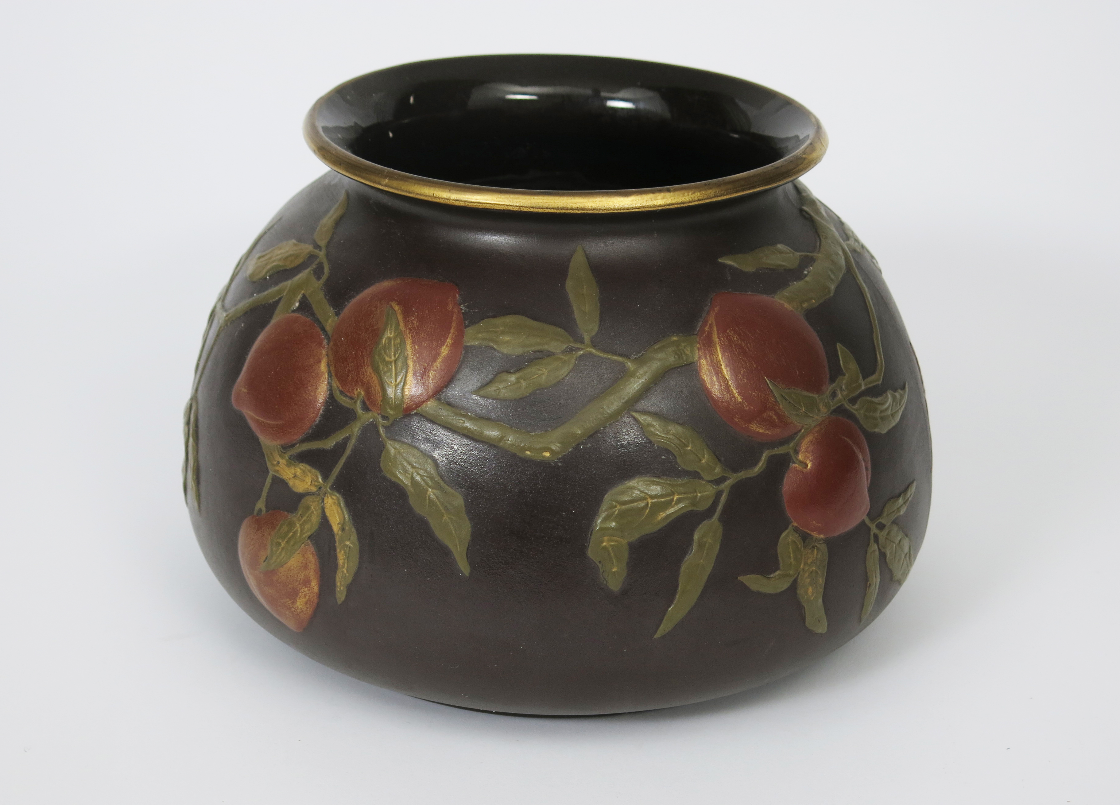 An Aesthetic Movement Minton's pottery vase, compressed form with everted rim, cast in low relief with a band of fruit and foliage in red, olive green and gilt on a brown ground impressed marks, 18cm. high