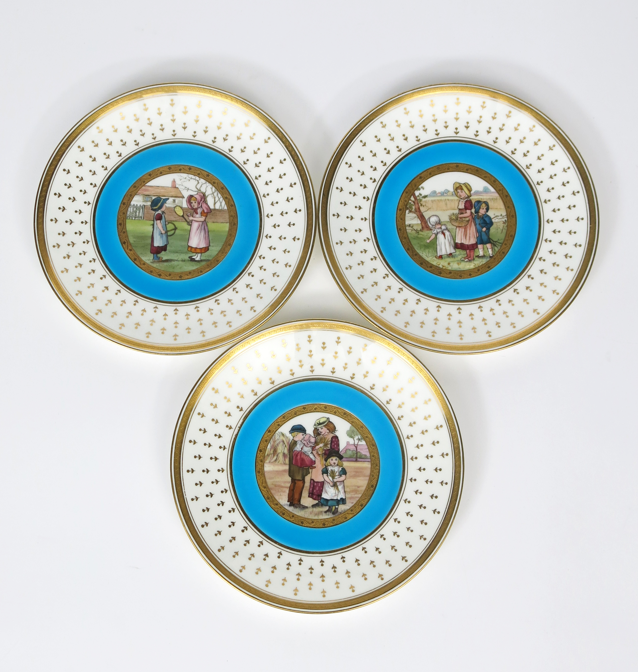 Three Minton's porcelain plates by William Wise, printed and painted to the well with Victorian children playing, picking flowers and harvesting corn, in colours, inside turquoise blue border and gilt bands to rim, impressed marks, one plate signed W Wise, 24cm. diam, (3)
