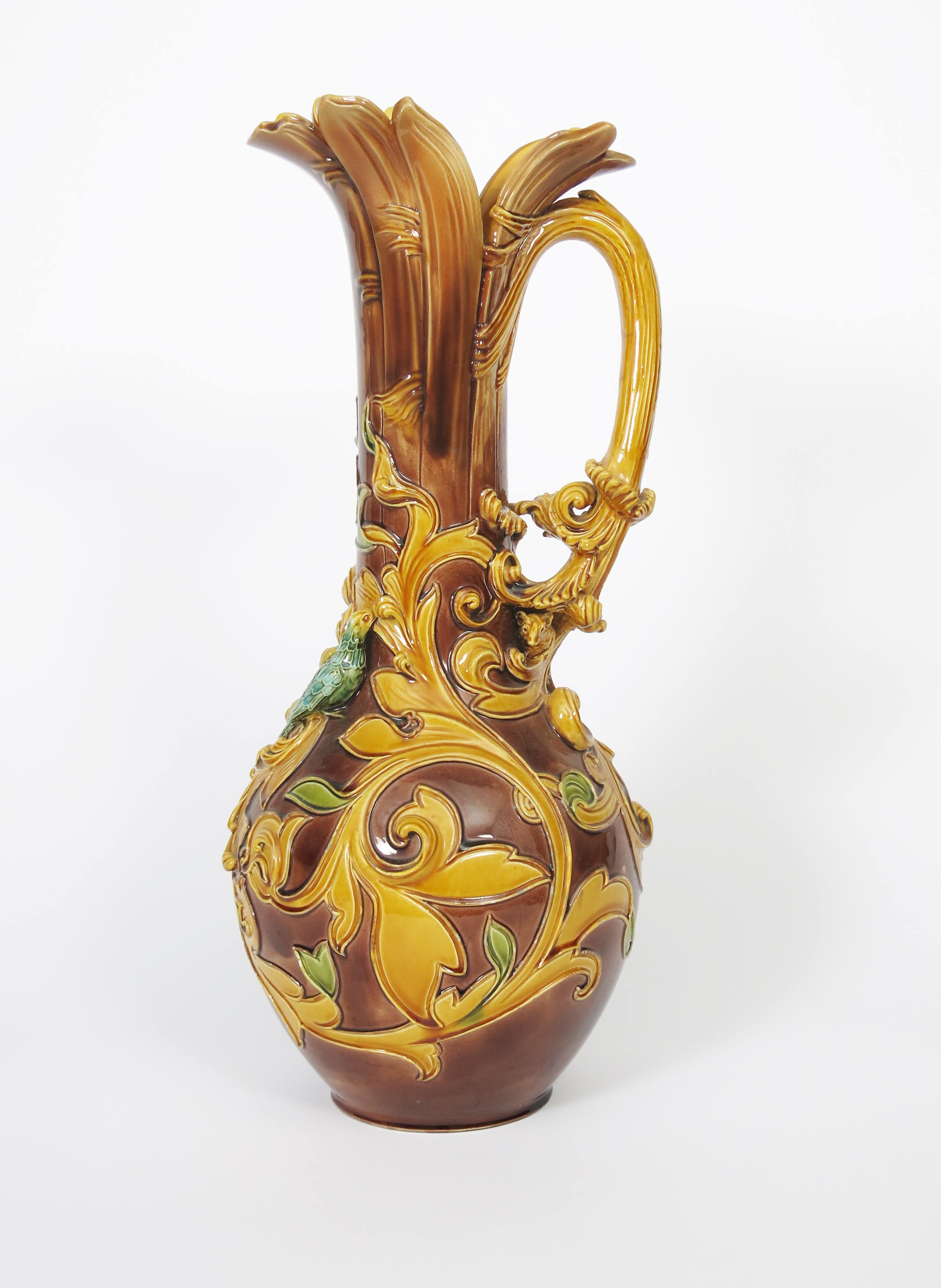 A tall Doulton Lambeth 'Harvest' jug by Mark V Marshall, ovoid body with tall cylindrical neck and scroll handle, modelled in relief with scrolling foliage with a bird perched and feeding, at the base of the handle a small mouse hiding and looking out, glazed yellow, green and turquoise on a brown ground, impressed marks, glaze loss to high points, professional restoration, 49cm. high