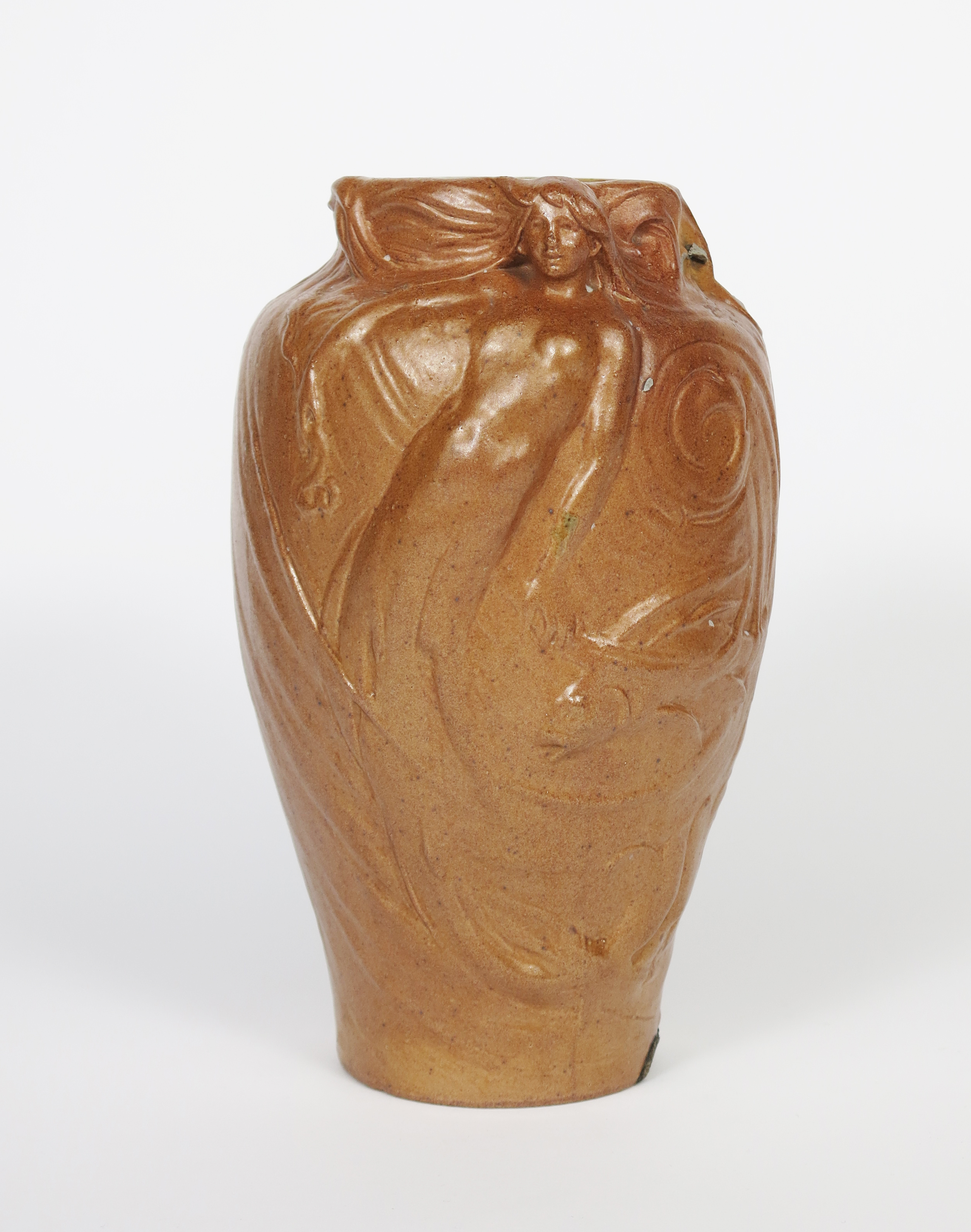 An Art Nouveau Royal Doulton Keramet stoneware vase designed by Francis Pope, shouldered form, modelled in relief with a sea maiden rising from turbulent waters, with a large scaly fish swimming, covered in a golden brown glaze, impressed factory marks, chips, 26cm. high