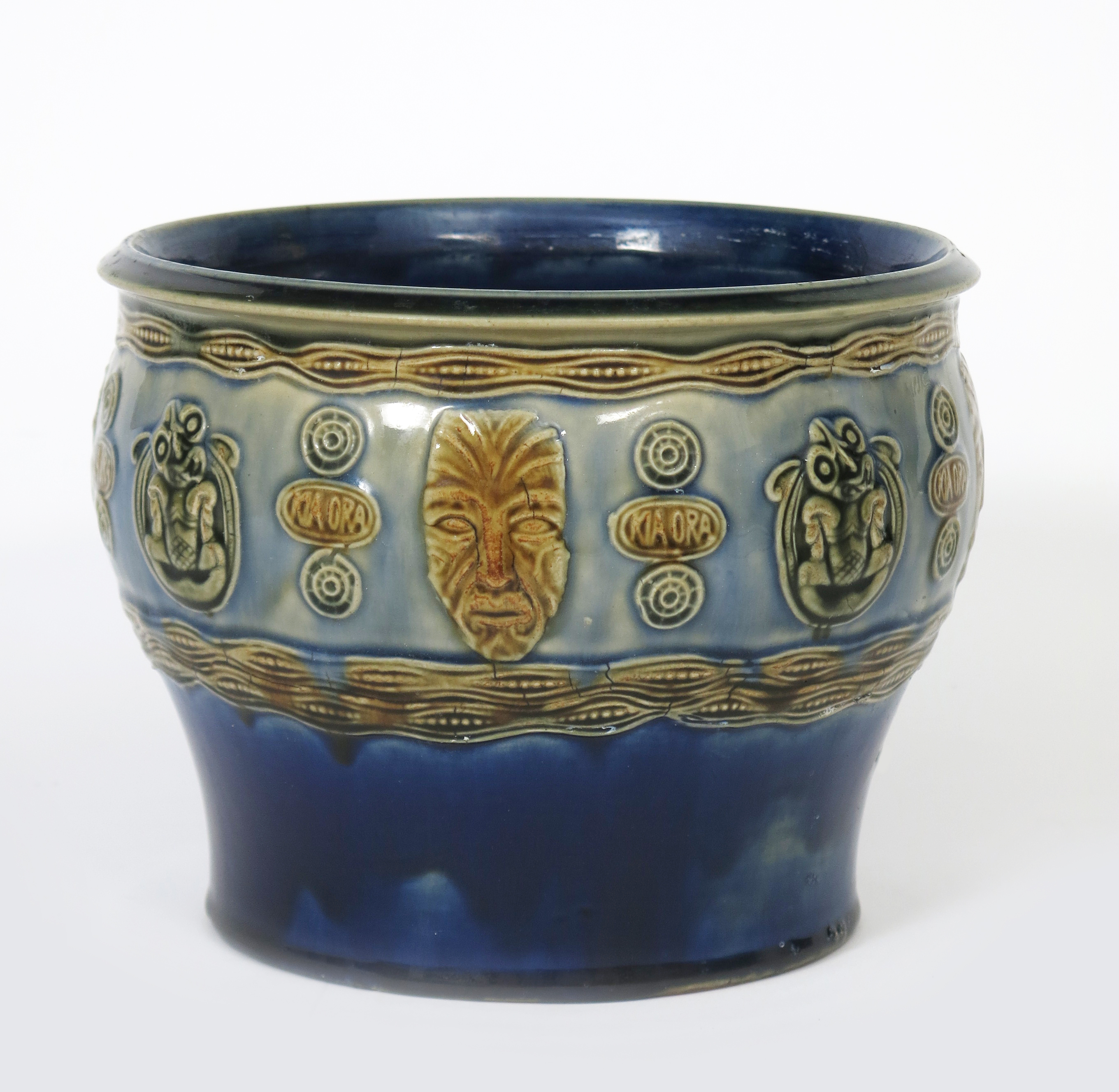 A Royal Doulton stoneware Maori jardiniere, swollen cylindrical form modelled in low relief with a band of Maori mask and tiki, interspaced with Kia Ora panels, glazed in shades of blue, brown and green unsigned, 18.5cm. high