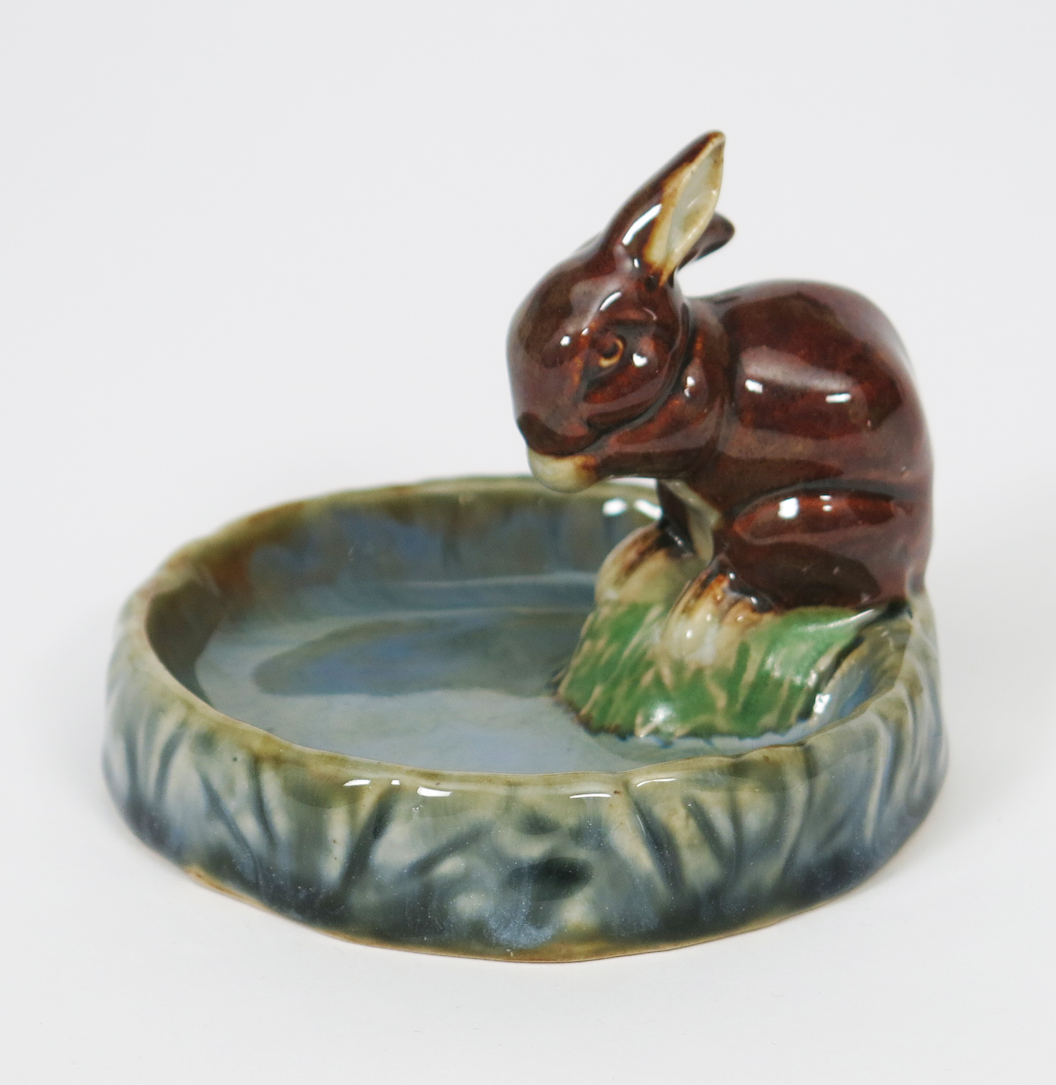 A Doulton Lambeth stoneware rabbit bibelot designed by Harry Simeon & Vera Huggins, the circular base modelled with a rabbit seated on haunches eating, glazed in colours impressed factory marks, 10cm. wide.