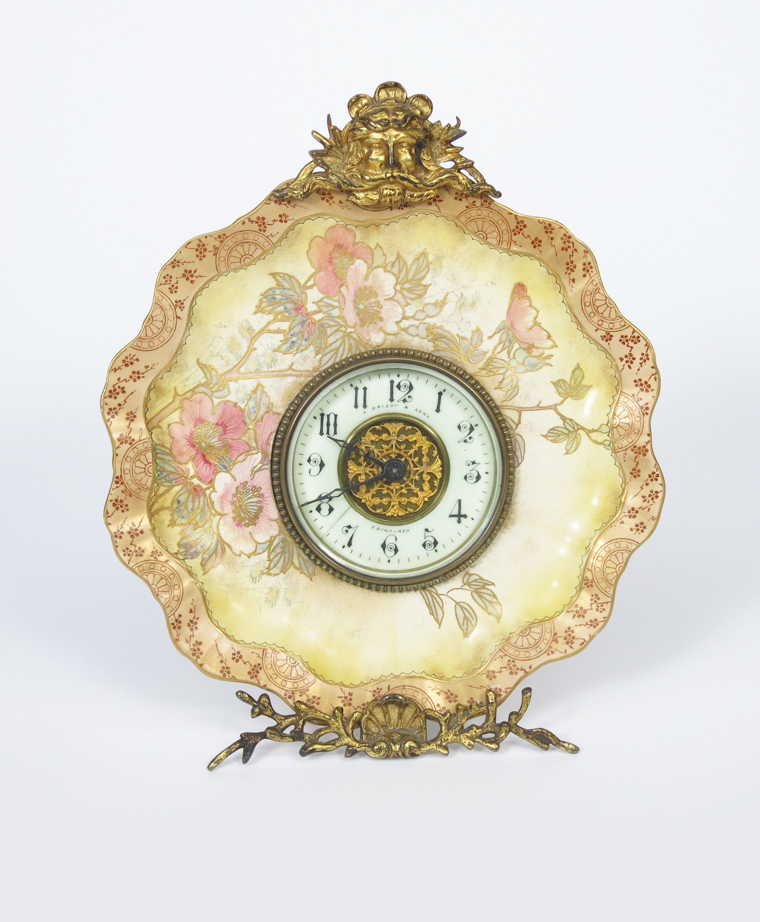 A rare Aesthetic Movement Doulton Burslem plate clock, with cast gilt metal mounts and easel back, the plate with fluted rim, printed and painted in colours and gilt with blossom sprays, on a pale yellow ground, the back with printed millefiori blossom gilt design, the circular dial with gothic scrolled numerals, stamped Doulton Burslem mark, the dial marked Bryson & Sons Edinburgh, 27cm. high