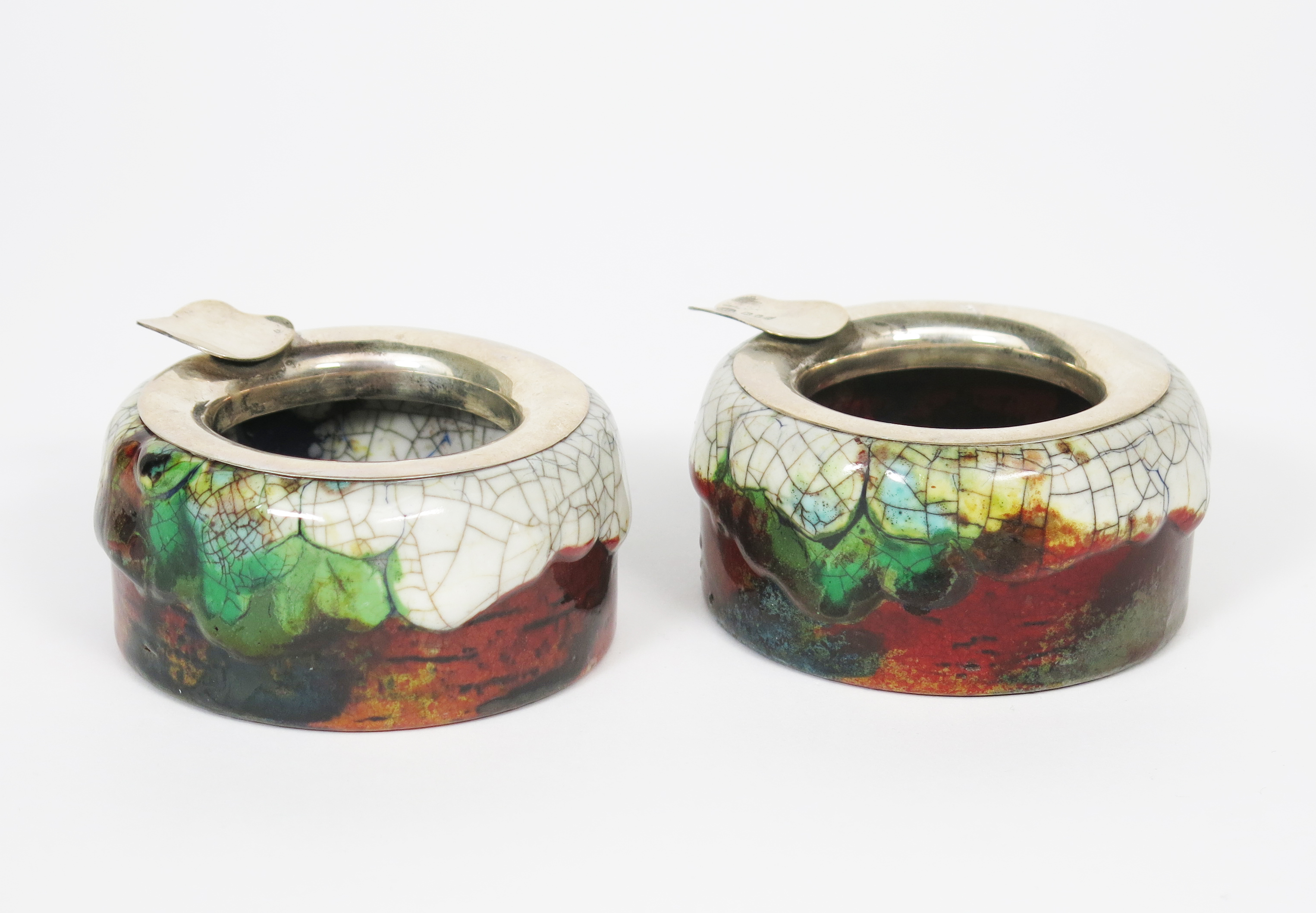 A pair of Royal Doulton Chang ashtrays with silver mounts designed by Charles Noke, by Harry Nixon, circular, shouldered form, the shoulder with running thick crackled white glaze splashed with green, yellow and turquoise, over a flambe red ground, painted Royal Doulton mark, Noke facsimile signature HN monogram and one mount hallmarked C B & S London 1928, the other without hallmarks, one professionally restored, 9cm. wide, (2)