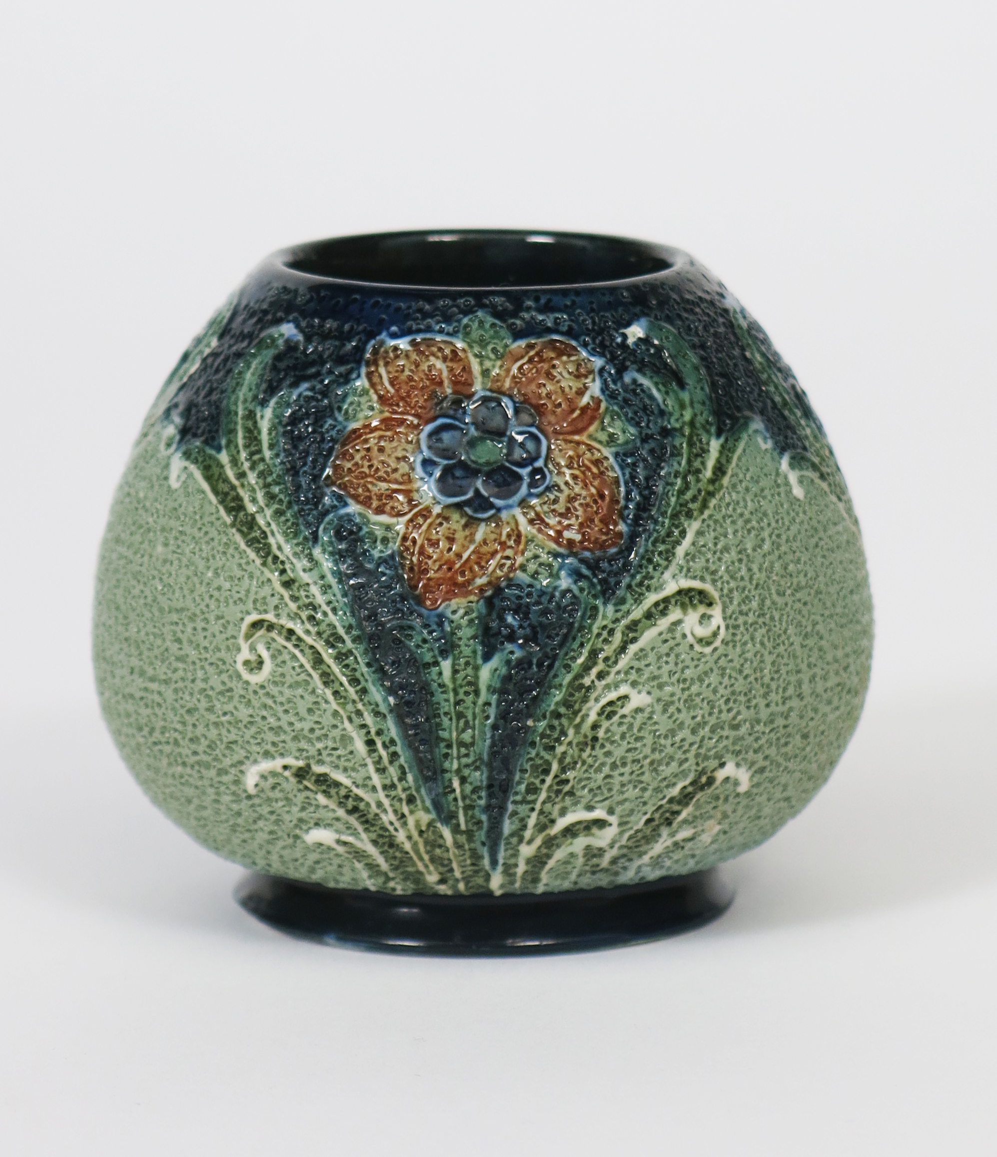 A James Macintyre & Co vesta designed by William Moorcroft, footed ovoid form, tubeline decorated with simple flower stem design with Art Nouveau scrolling foliage, in shades of red and blue on a textured celadon ground, painted green WM signature, professional restoration to foot rim, 7cm. high