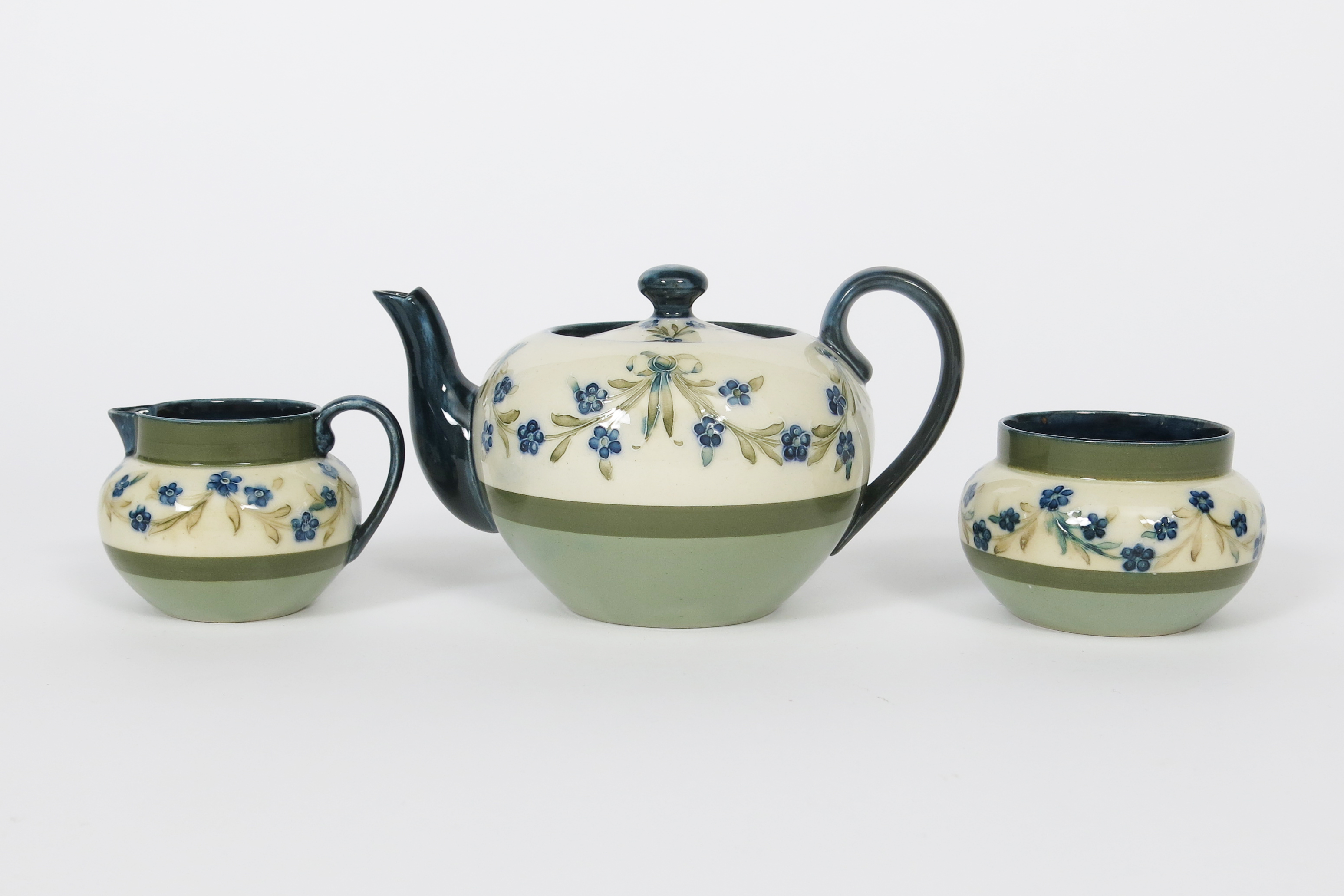 A James Macintyre & Co tea set probably designed by William Moorcroft, tubeline decorated with swags of blue flowers, in blue and green above a celadon band on cream, comprising teapot and cover, milk-jug and sugar basin, printed factory mark, 10cm. high (teapot), (4)