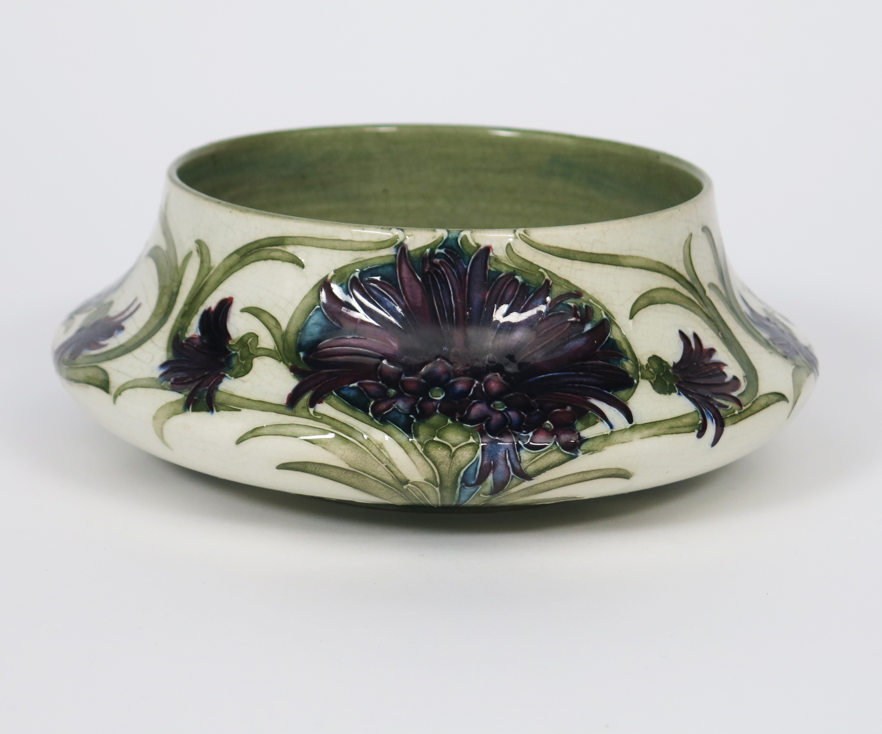 'Revived Cornflower' a Moorcroft Pottery bowl designed by William Moorcroft, circular section with tapering shoulder, painted in shades of purple and green on a white ground, painted green signature, 19.5cm. diam.