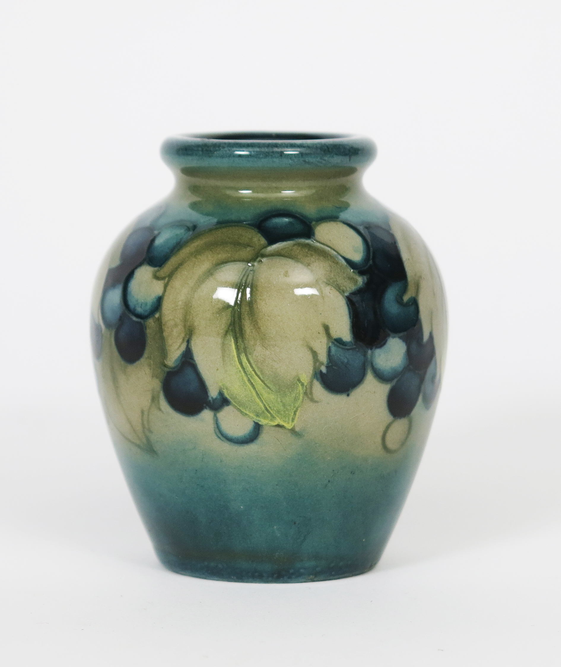 'Leaf and Berry' a Moorcroft Pottery vase designed by William Moorcroft, shouldered form, painted in shades of green, blue and yellow, on a celadon ground, impressed factory marks, 8.5cm. high