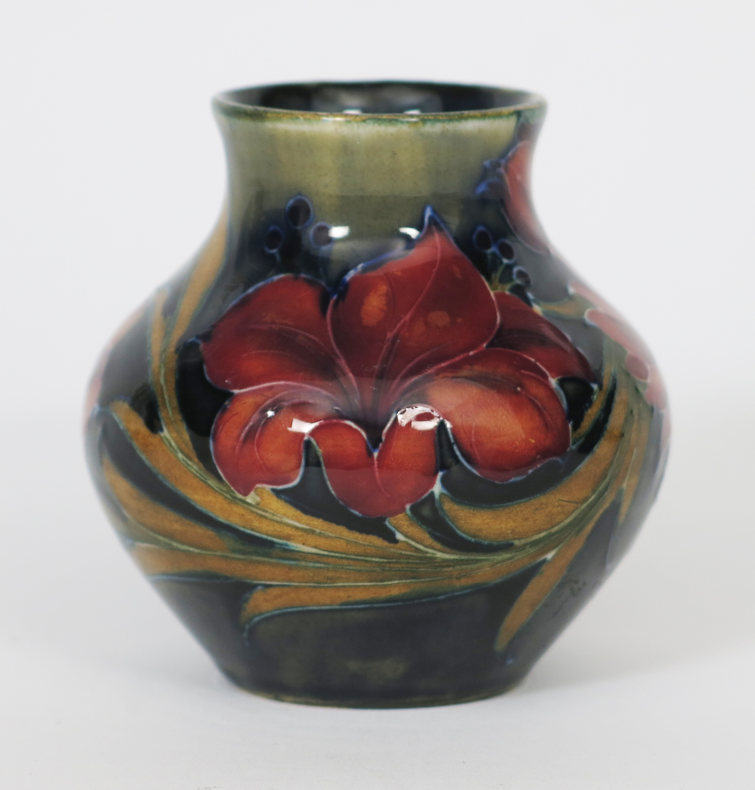 'Spanish' a Moorcroft Pottery vase designed by William Moorcroft, ovoid with small cylindrical neck, painted in shades of red, purple, ochre and blue on a blue and green ground, painted green signature, minor professional restoration to top rim, 8cm. high