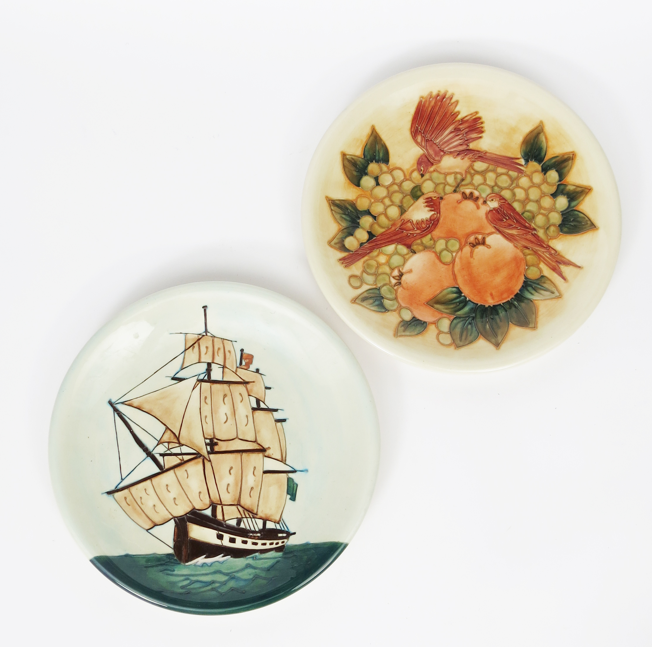 'HMS Sirius' a modern Moorcroft Pottery limited edition wall charger designed by Sally Tuffin, painted in colours on a cream ground, and another Moorcroft 'Finches' charger impressed marks, painted number and WM monogram, 35cm. diam. (2)