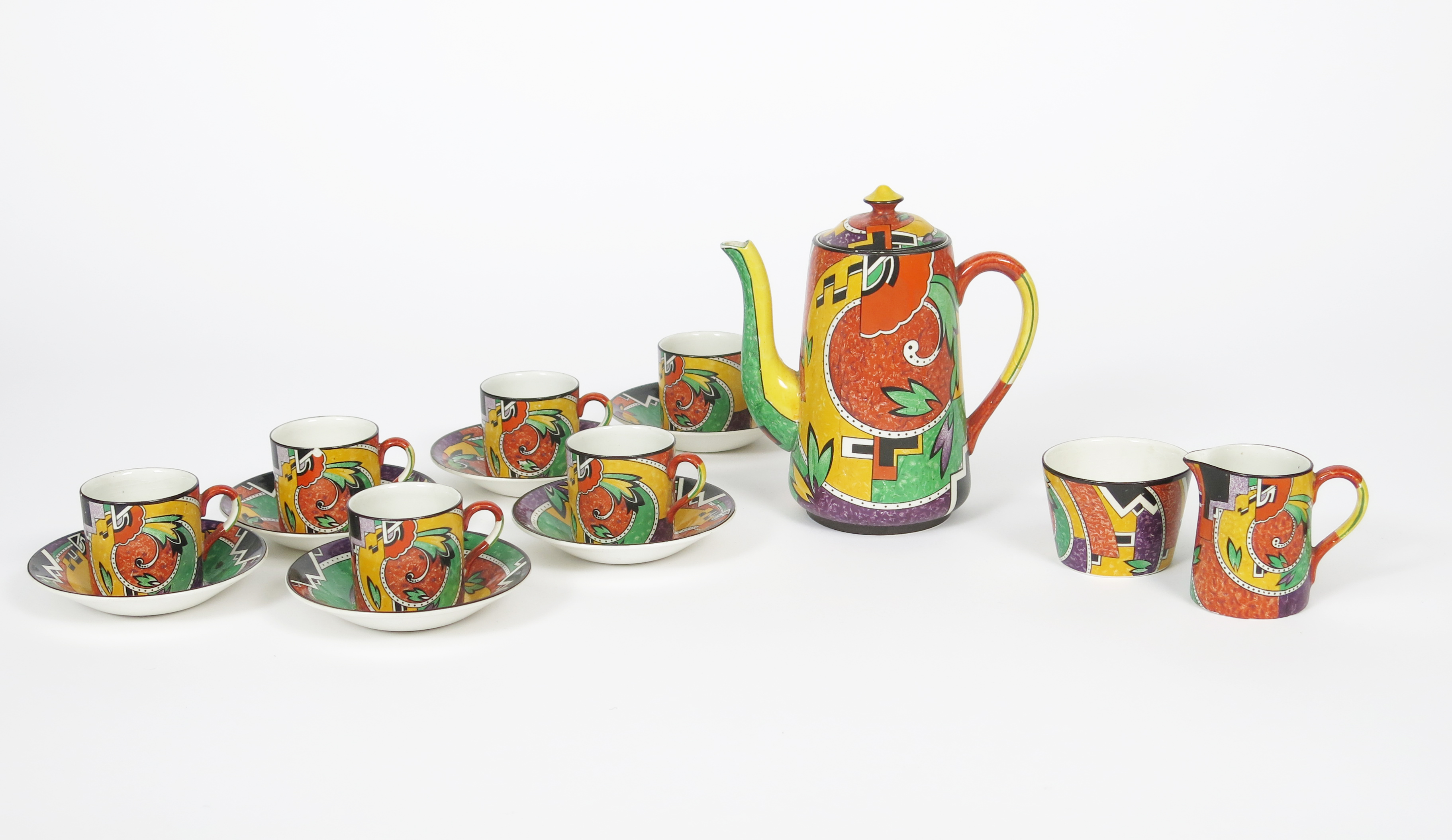 An Art Deco Royal Winton Jazz coffee set for six, painted with a geometric foliate design in colours, comprising; coffee pot and cover milk-jug and sugar basin, six cans and saucers printed factory marks, 18.5cm. high (coffee pot),