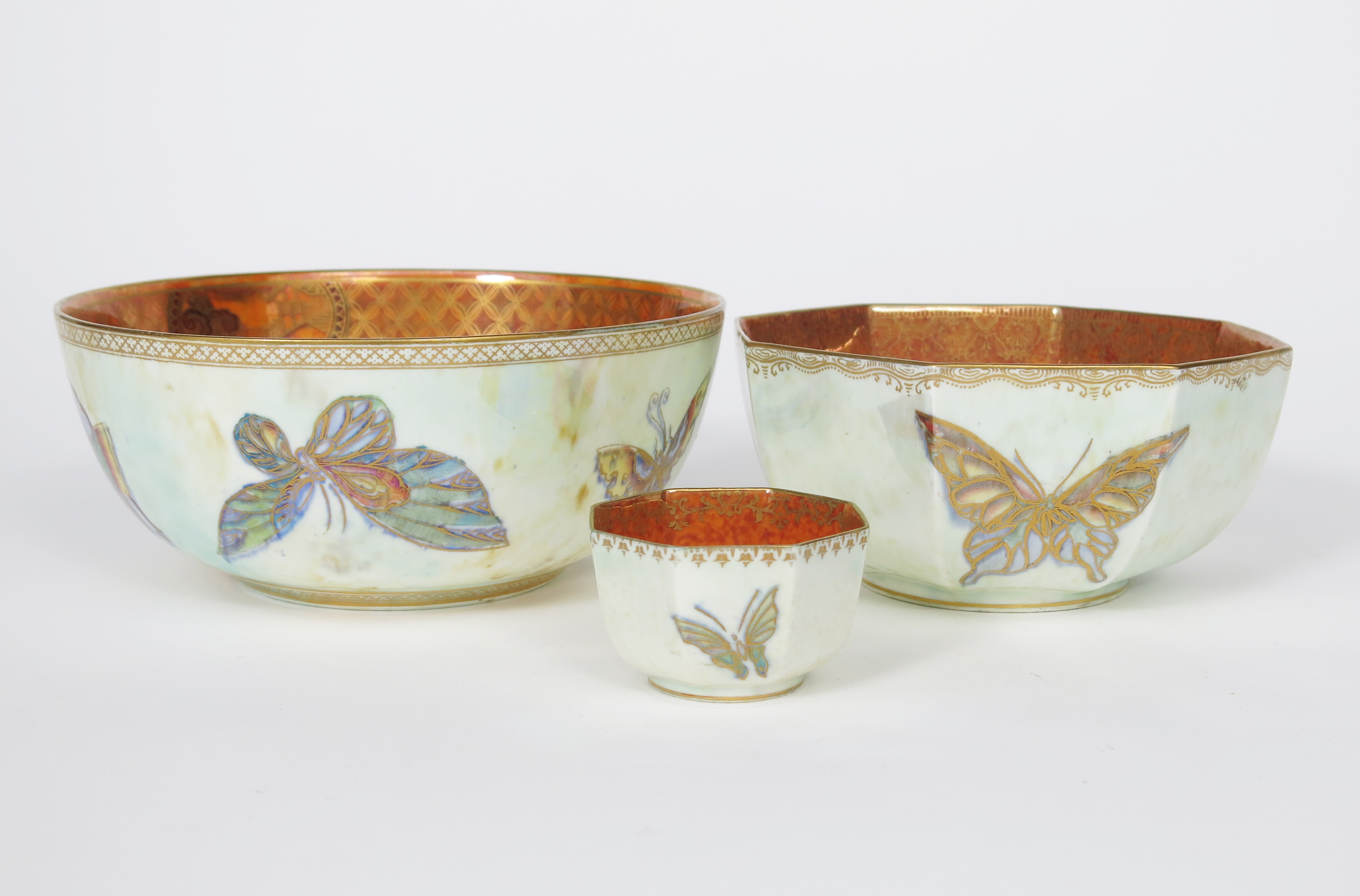 A Wedgwood Butterfly lustre bowl designed by Daisy Makeig-Jones, printed and painted with exotic butterflies to interior and exterior, the exterior on a pearl lustre ground, and two other graduated Wedgwood Butterfly Lustre octagonal bowls, printed and painted marks, 20cm. diam. (3)