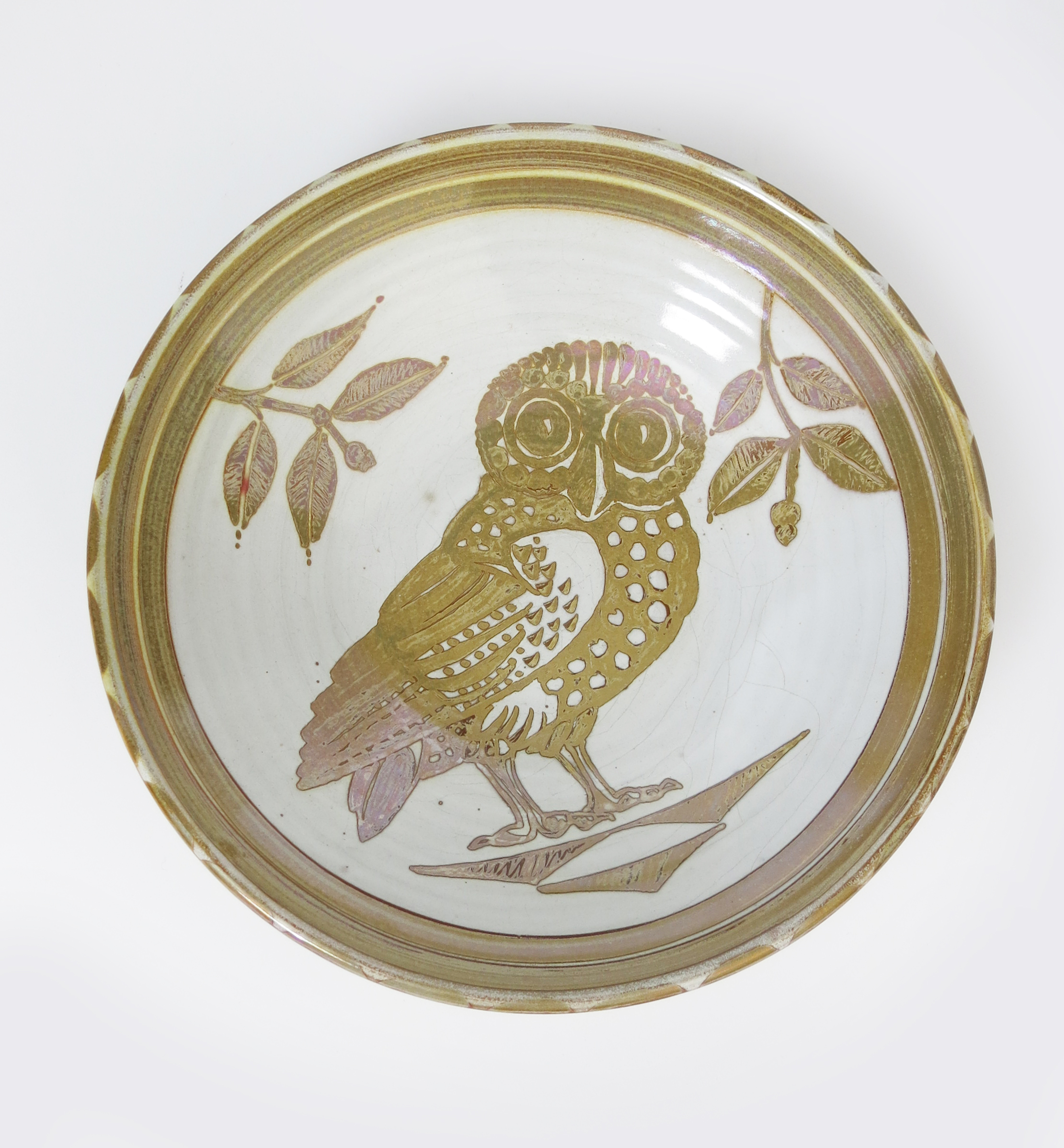 an Aldermaston Pottery bowl, painted to the interior with an owl, in golden lustre on a grey ground, the exterior with fluting, painted marks, indistinct year mark, 25cm. diam.