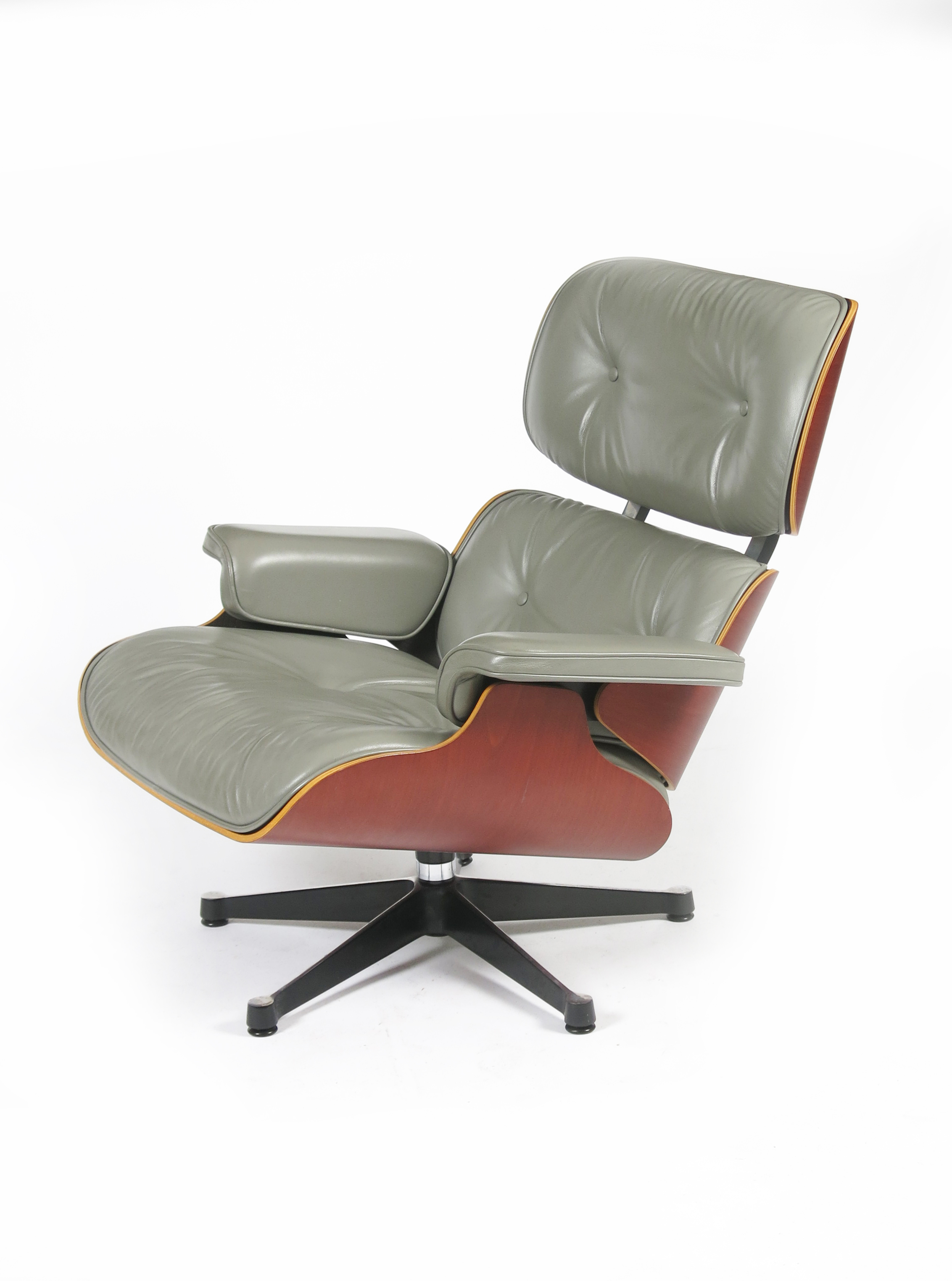 A modern Vitra cherry wood veneer and grey leather 670 lounge chair originally designed by Charles & Ray Eames for Herman Miller, dated 2005, applied Vitra labels M13 dated 2005, 82cm. high