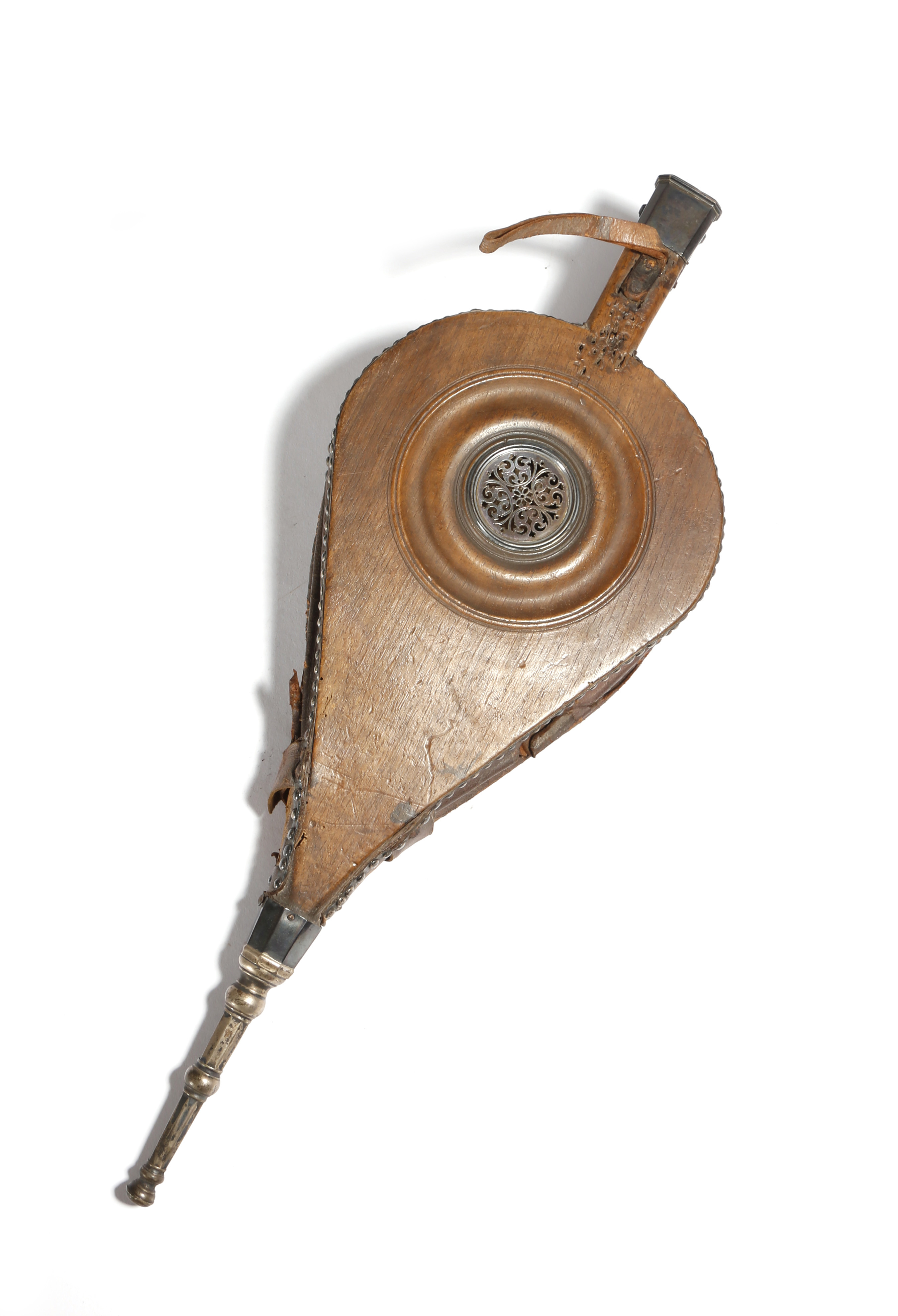 A pair of early 18th century walnut silver mounted bellows, the faceted handle engraved with a coat of arms for Horner of Mells impaling Strangeways, the back with a pierced rondel, 57.8cm long.