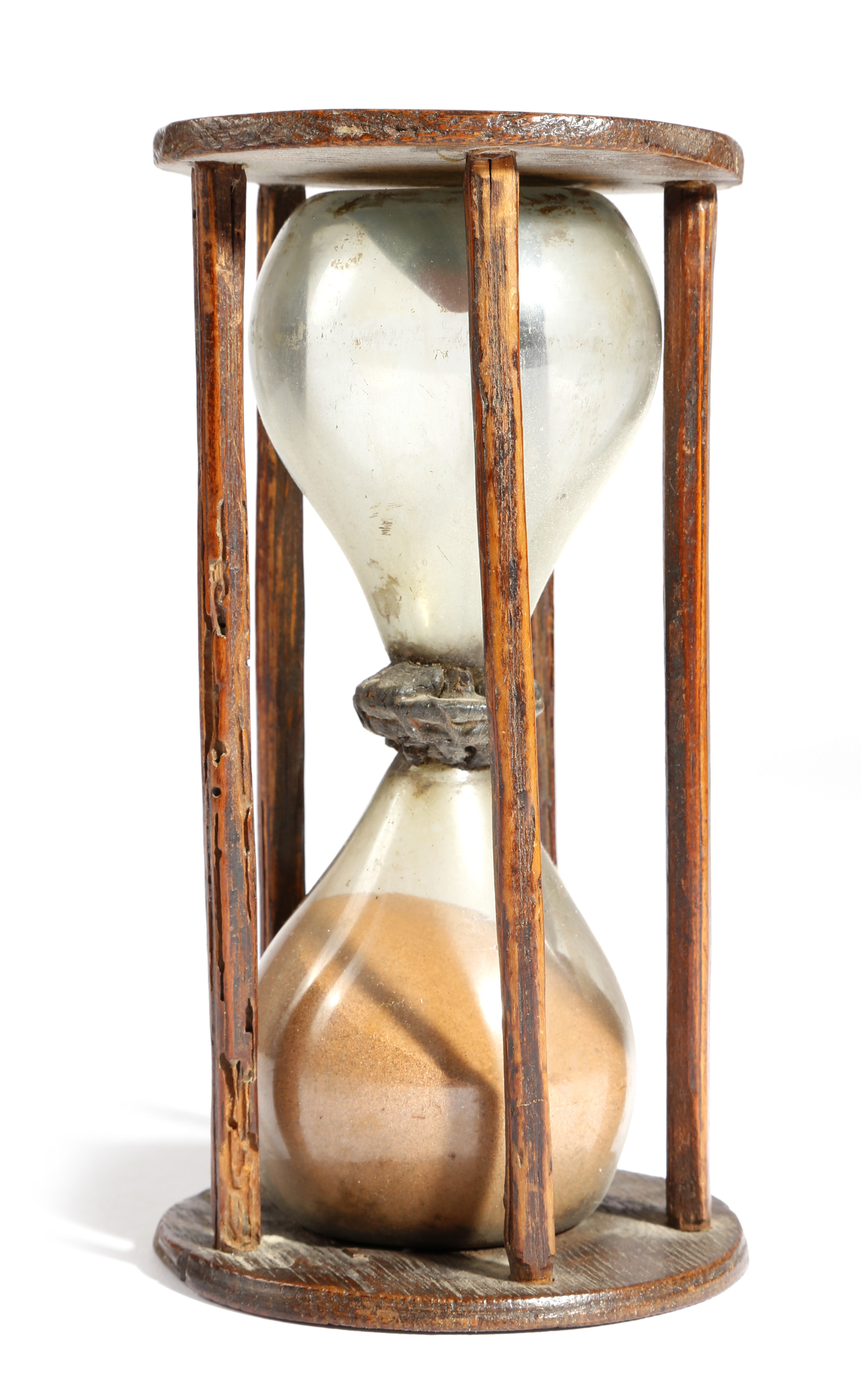 An early 18th century ash sandglass, with four stick supports, the double hourglass bulbs connected with a wax collar, the sand runs for approximately fifty-six minutes,17.2cm high.