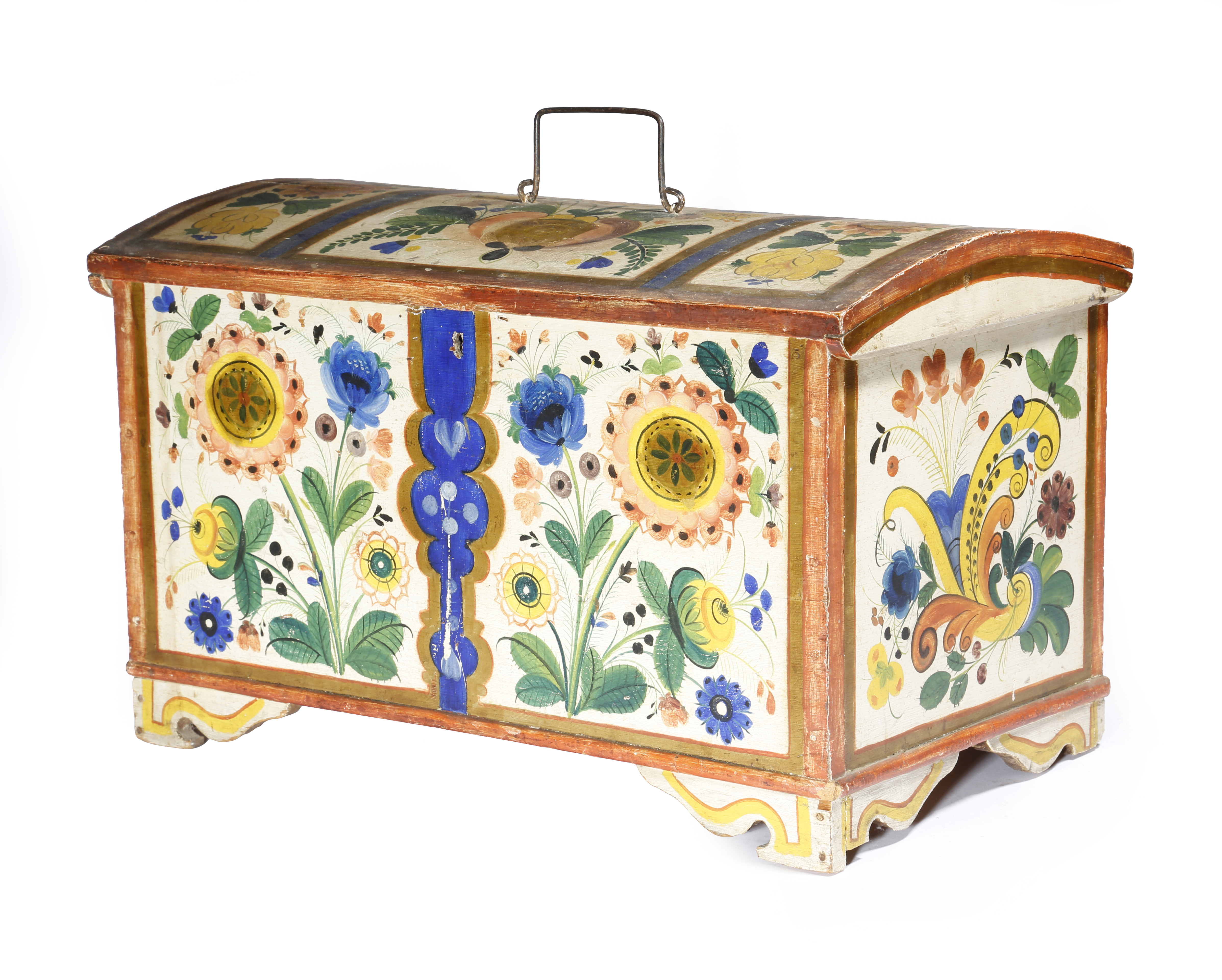 A Norwegian folk art painted pine trunk, decorated all over with panels of flowers, the domed lid with an iron handle, revealing a lidded till, the back with an inscription, on bracket feet, late 19th / early 20th century, 29.7cm high, 49.3cm wide, 27.1cm deep.