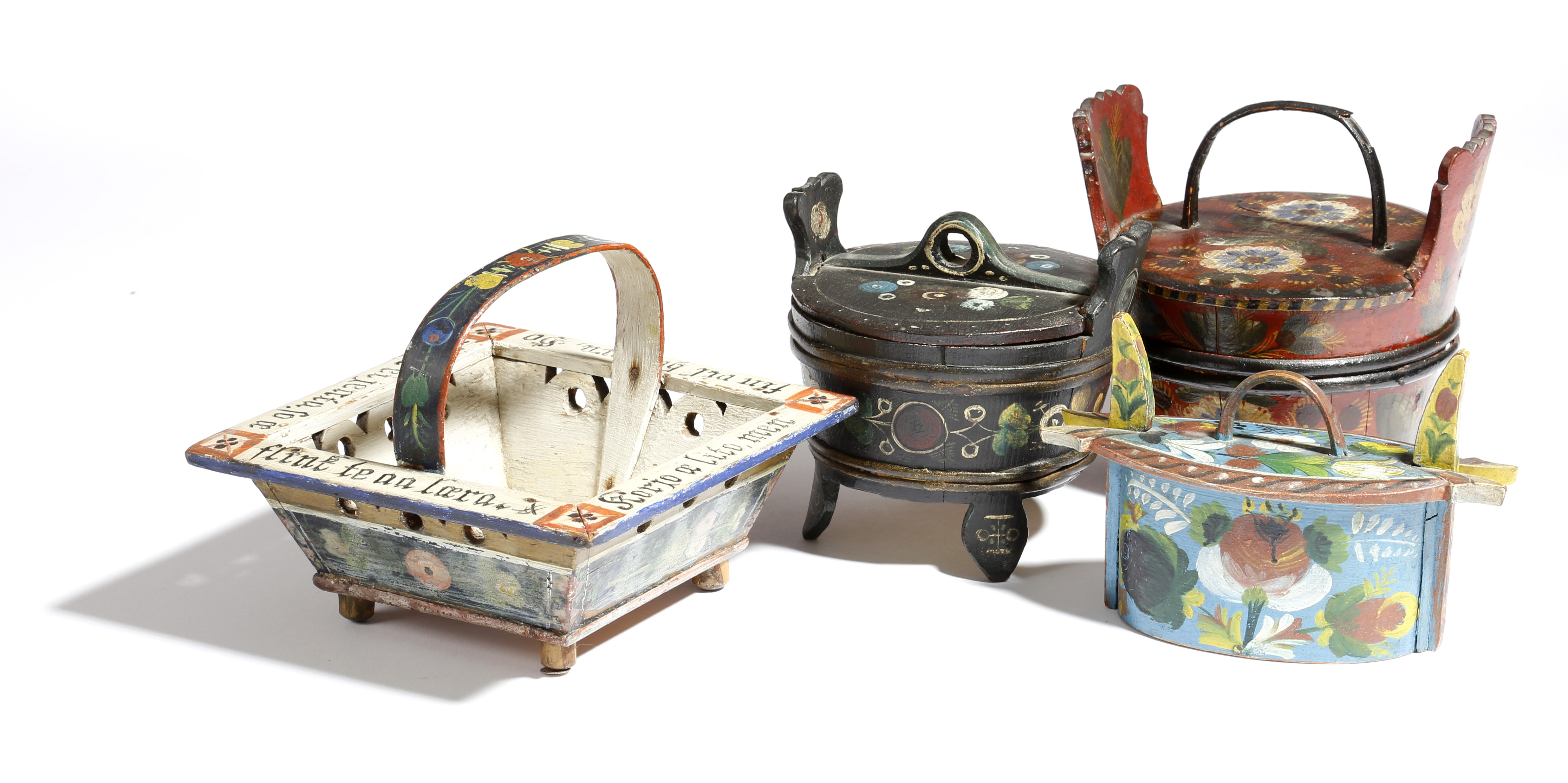 Three late 19th century Norwegian folk art painted pine food boxes, each decorated with flowers, one with an inscription, together with a similar basket, the rim with an inscription and with a pierced body, 16cm (max). (4)