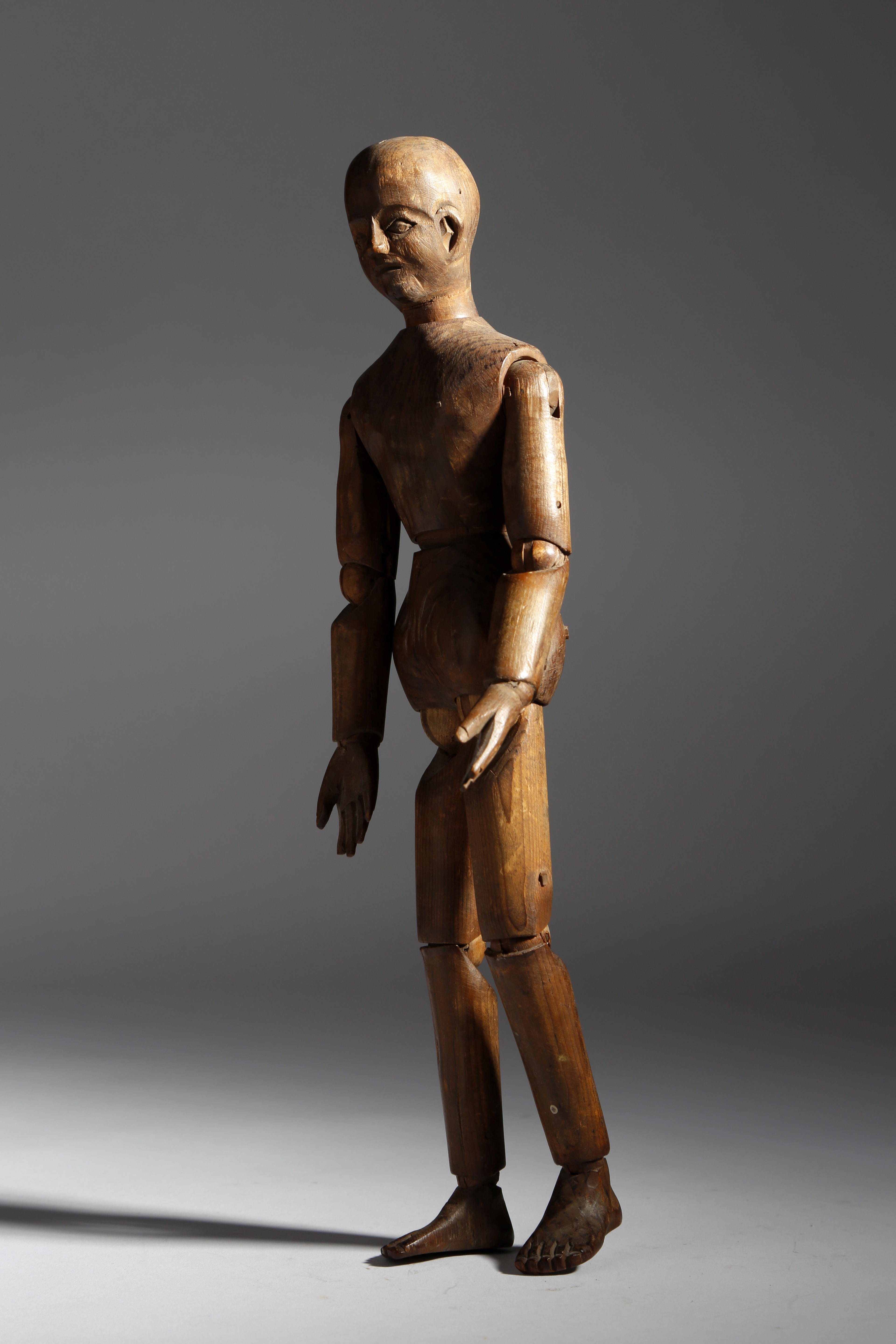 A late 19th century French pine artist's lay figure, with articulated arms and legs, with pencil inscriptions to back, 33cm high.