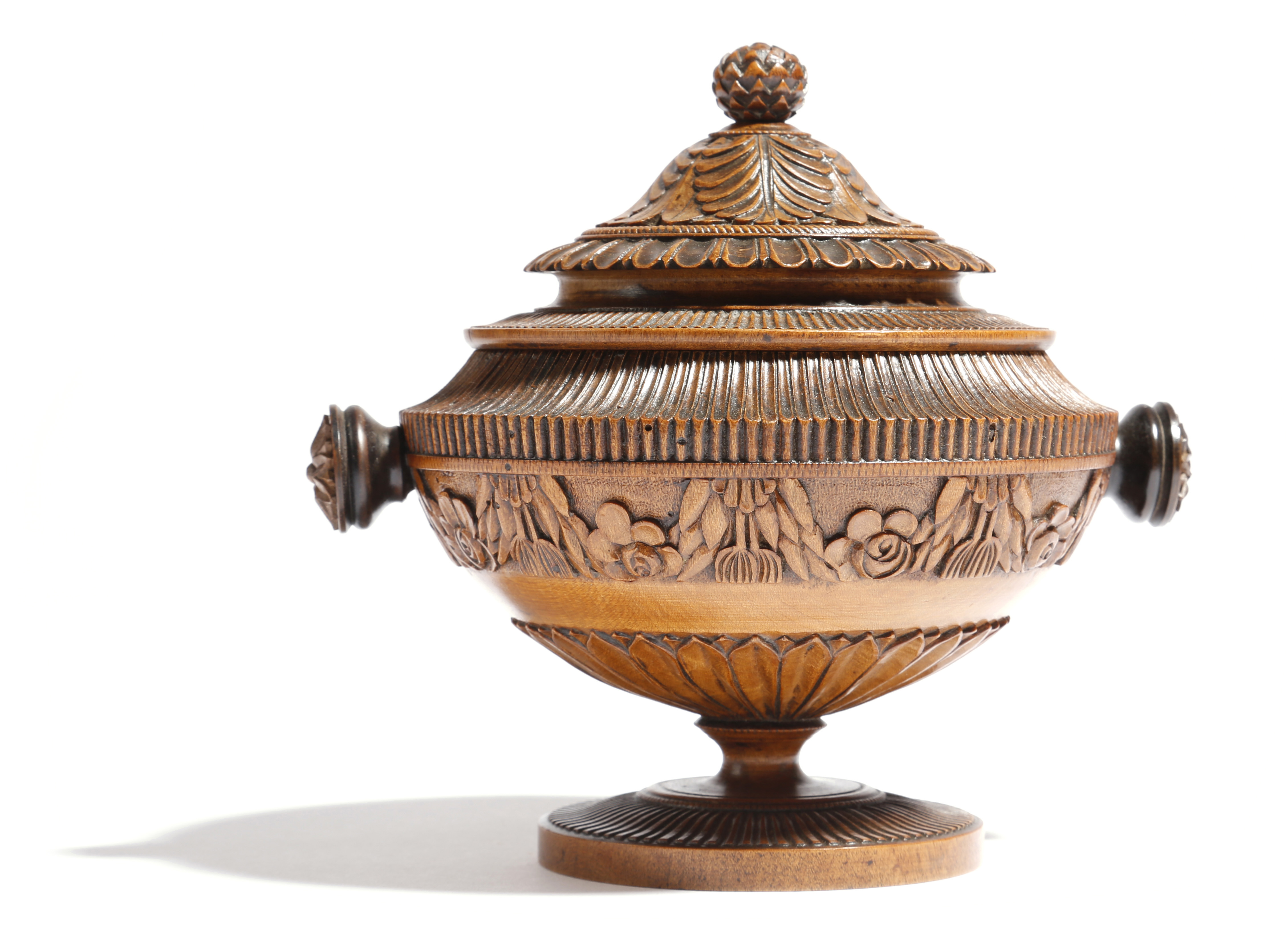 A North European treen turned and carved urn and cover, with a cone finial and leaf decoration, the body with fluted borders, above swags of flowers, on a ribbed foot, possibly Scandinavian, 17cm high.