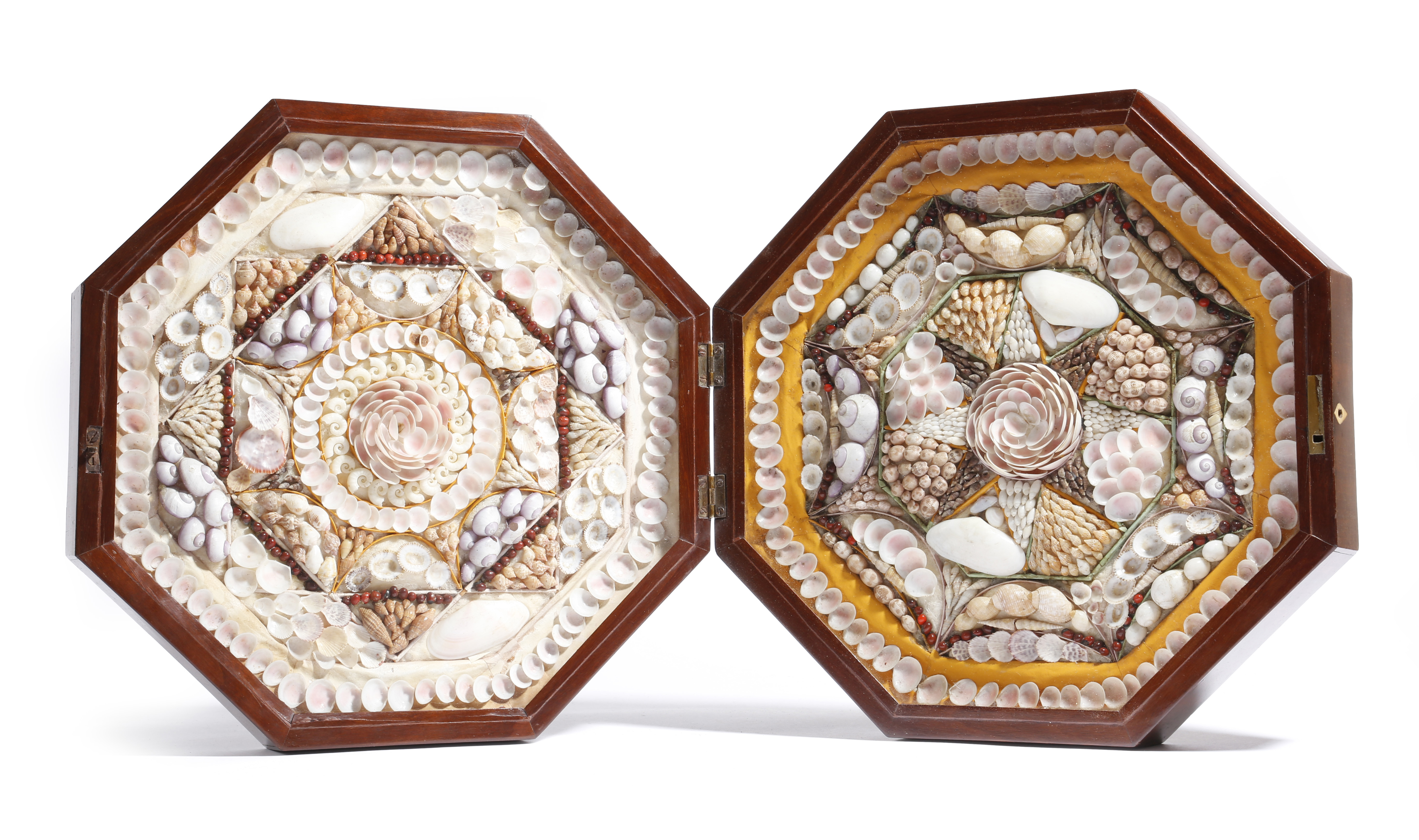 An early Victorian sailor's shell valentine, the mahogany and goncalo alves banded hinged and glazed octagonal case revealing a pair of shellwork panels of flowers, geometric designs and swags, with a bone escutcheon, 64.3cm across.