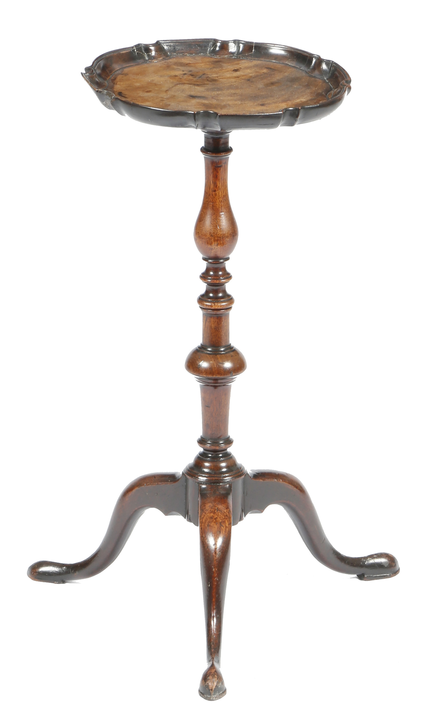 A late George II mahogany wine stand, the circular top with a pie-crust moulded edge, on a baluster turned stem, on cabriole legs and pointed pad feet, 50.9cm high, 34.5cm wide.