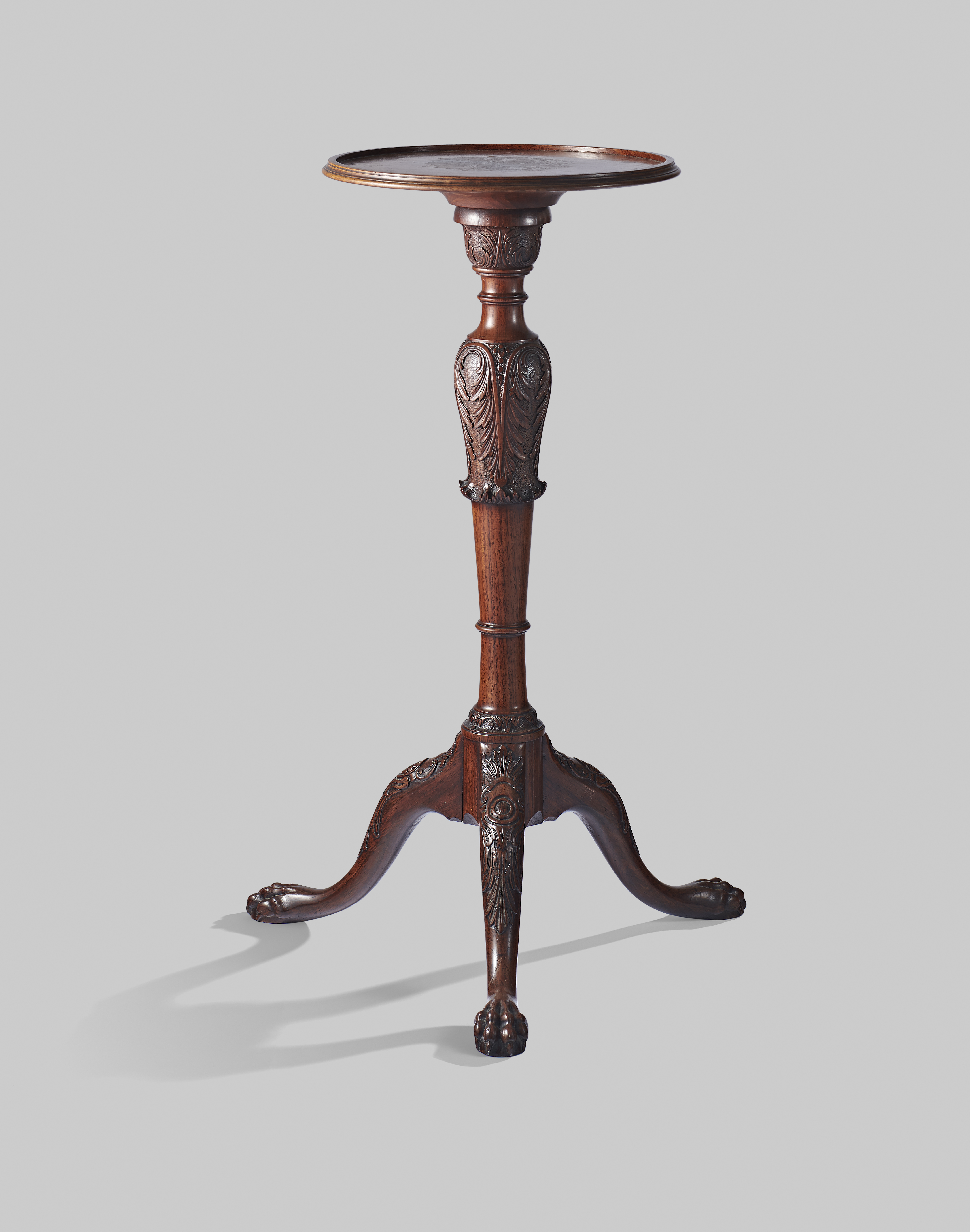 λ A rare George II rosewood torchere or candlestand, the circular dished top with a moulded edge, above a turned acanthus leaf carved baluster stem, on tripod cabriole legs, each carved with a cartouche and leaves, on lion's paw feet, 78.2cm high, 51cm wide.