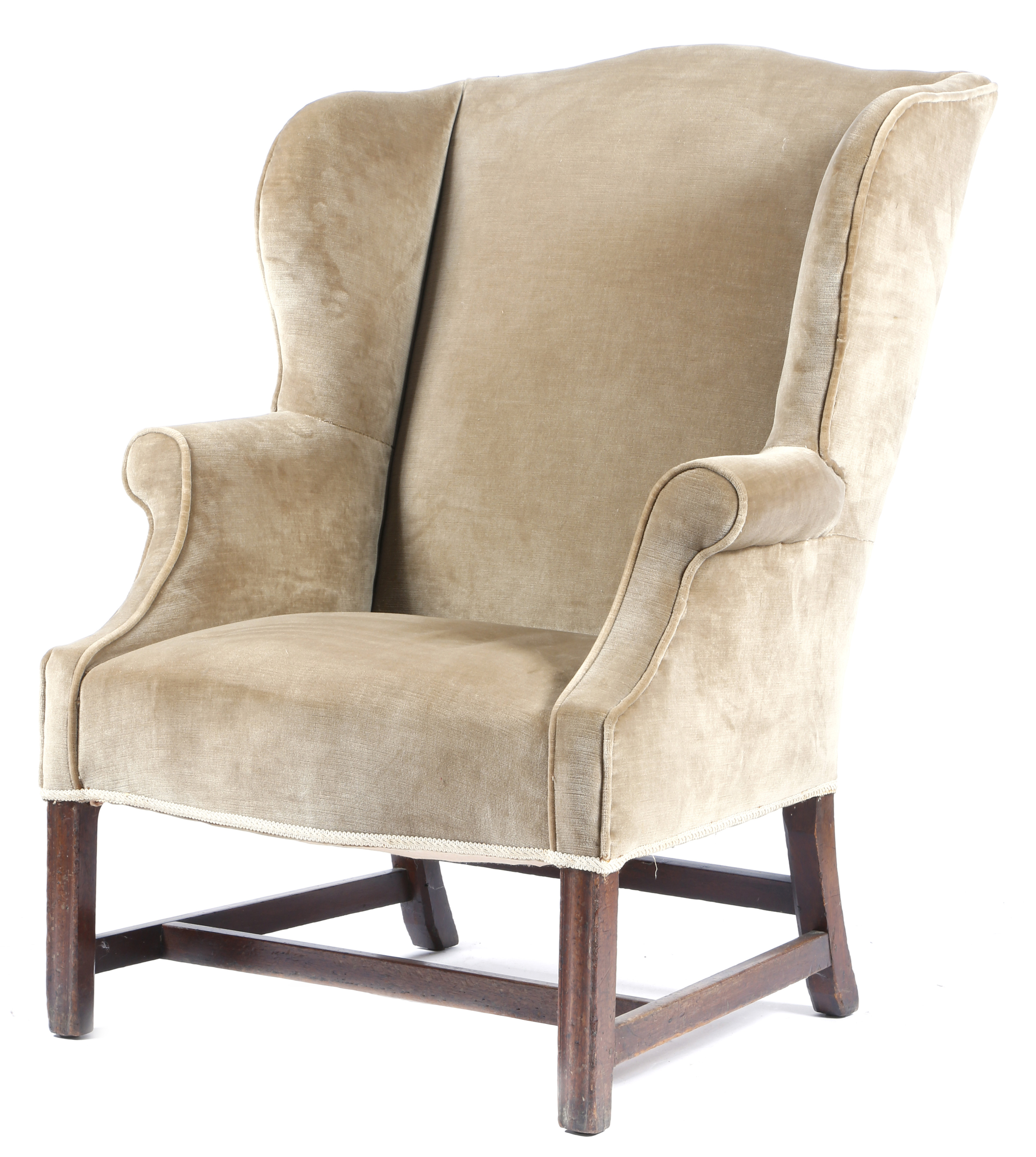 A George III mahogany wing armchair, later upholstered with plush fabric, with a serpentine front seat, above moulded front legs united by 'H' stretchers.