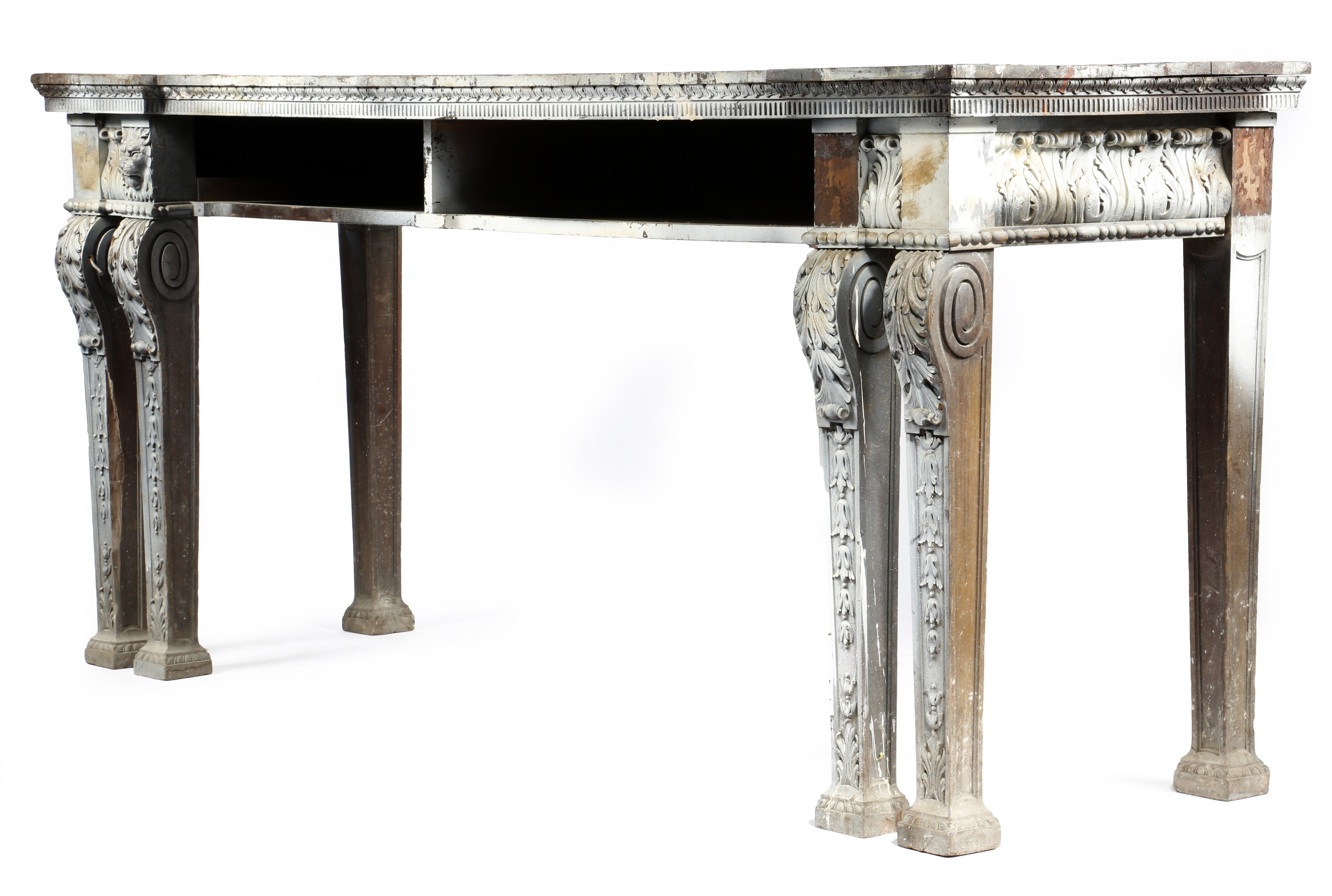 A mahogany serving table in George II style, the rectangular top above a leaf carved and fluted moulding, with a carved leaf and female mask frieze, originally with two drawers flanked by carved lion's masks, on acanthus capped twin scroll legs, with panels of bell flowers, 19th century but later painted and in a distressed condition, 99cm high, 213.5cm wide, 68.3cm deep.