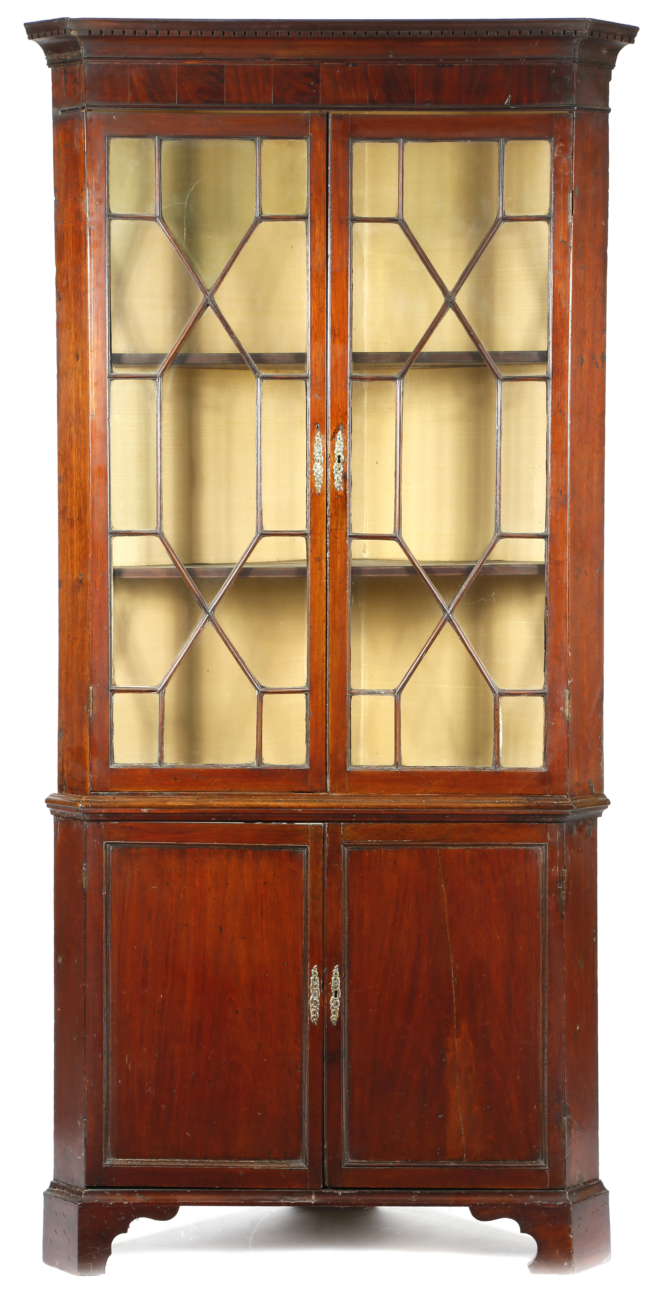 A George III mahogany standing corner cupboard, the dentil cornice above a pair of astragal glazed doors, enclosing two shelves, above a pair of panelled doors, enclosing a shelf on bracket feet, 221.6cm high, 108.3cm wide, 51.6cm deep.