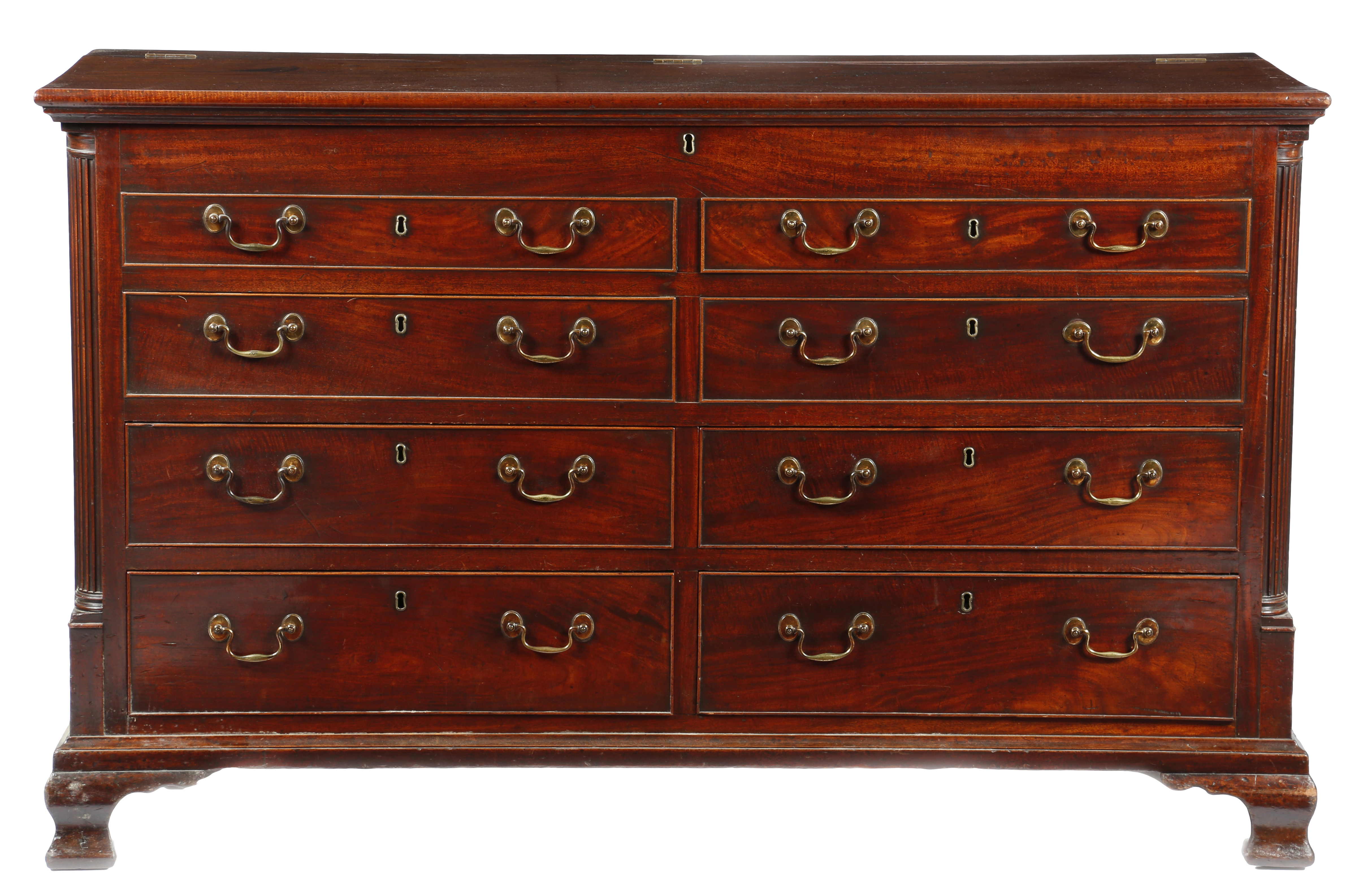 A George III Lancashire mahogany mule chest, the hinged top revealing a vacant interior, above four false drawer fronts and four real drawers, flanked by quarter pilasters, on ogee bracket feet, 94.4cm high, 151.8cm wide, 54.7cm deep.