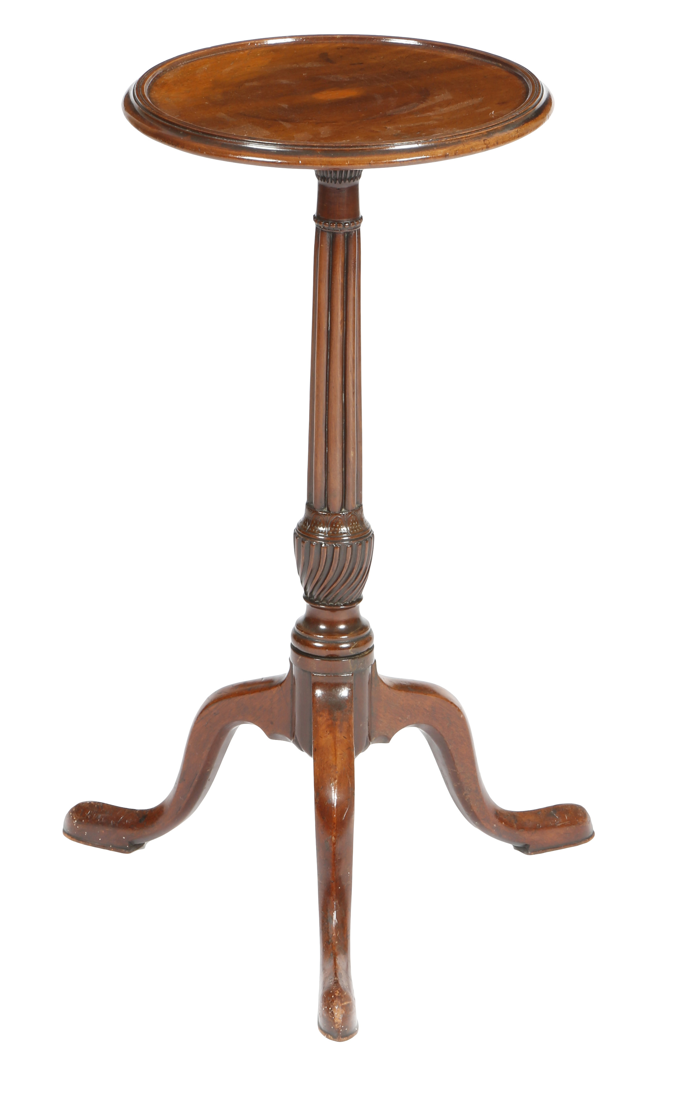 A mahogany tripod wine table, the dished fixed top on a cluster column stem, on cabriole legs and pad feet, 62.7cm high, 40.5cm wide.