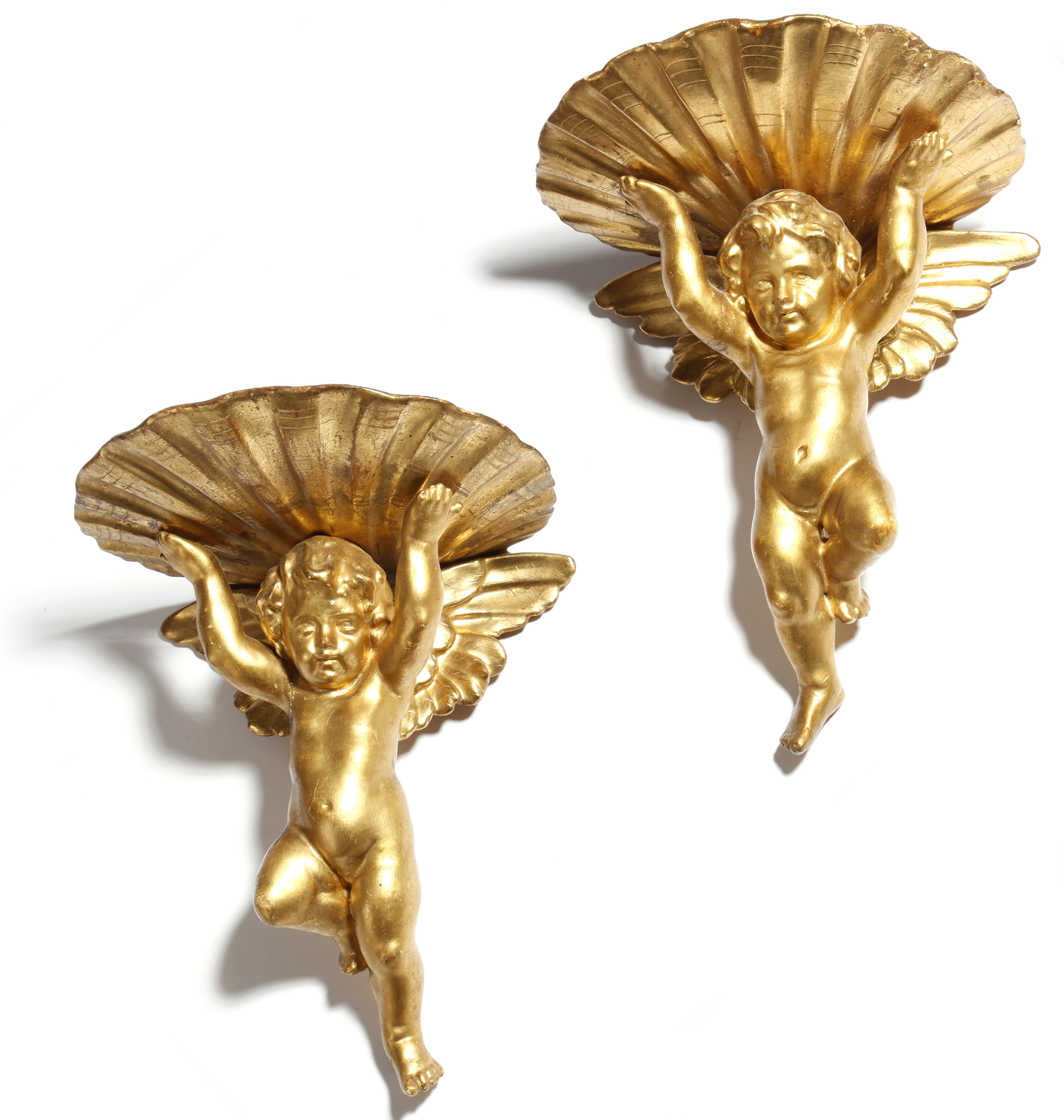 A pair of 19th century Italian giltwood wall brackets in Baroque style, each in the form of a winged cherub supporting a shelf, 21cm high, 17.5cm wide. (2)