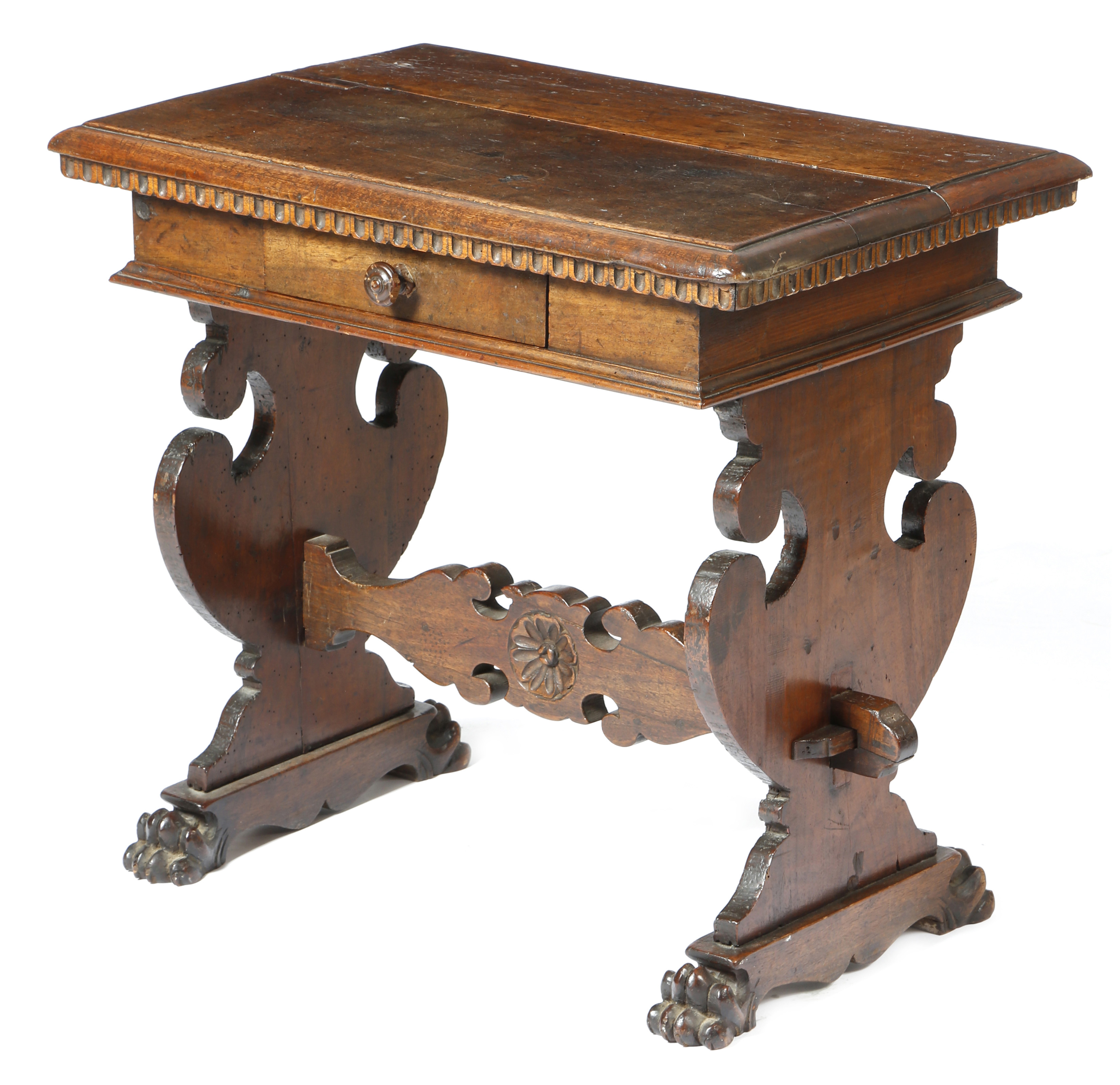 An Italian walnut occasional table, in Renaissance style, the boarded top above a thumbnail frieze and a drawer, on cartouche shape trestle ends united by a stretcher, on paw feet, 61.5cm high, 66cm wide, 46cm deep.