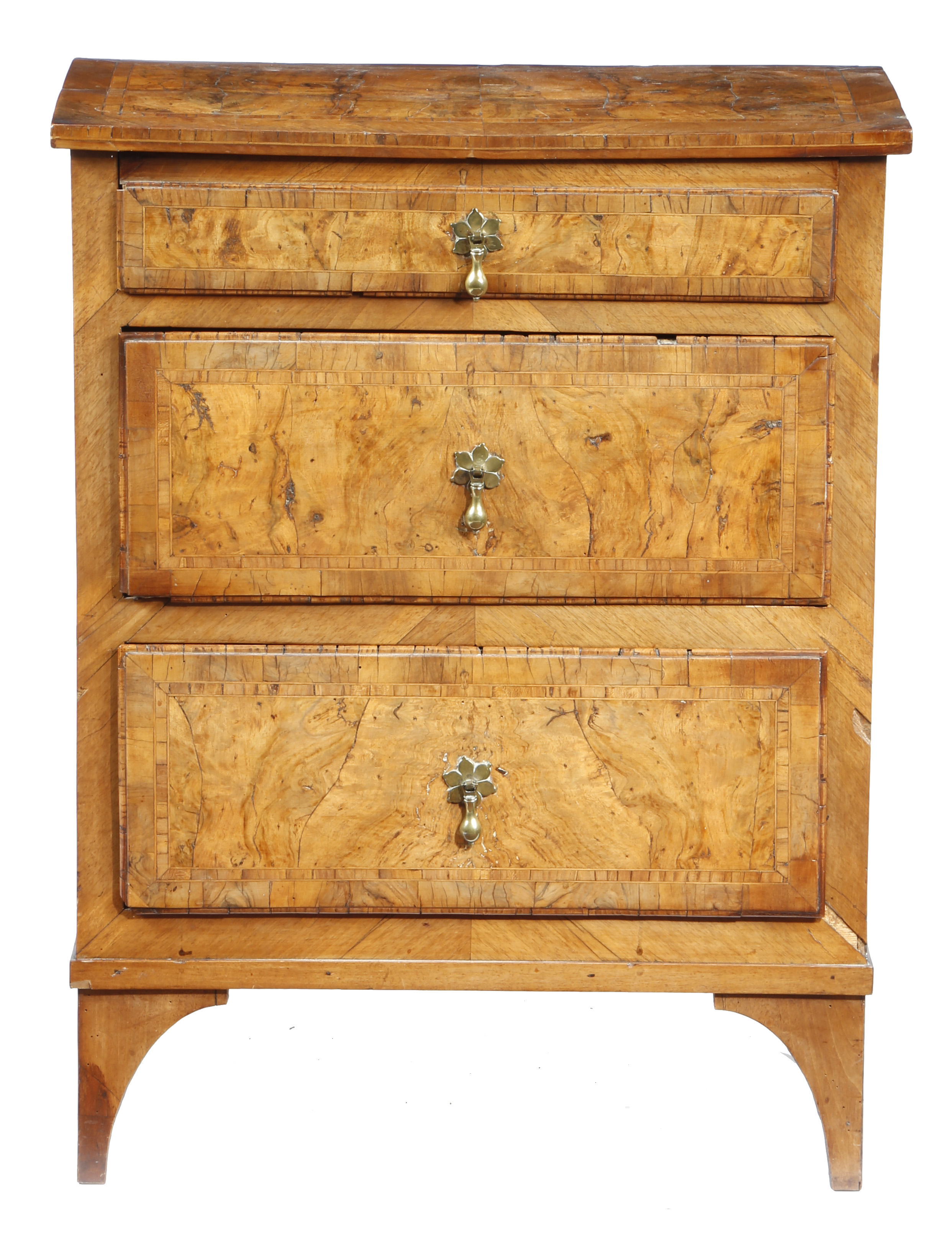 An Italian walnut chest, with burr veneered panels and fitted with three drawers, on bracket feet, late 18th / early 19th century, 82.3cm high, 63.2cm wide, 33.1cm deep.