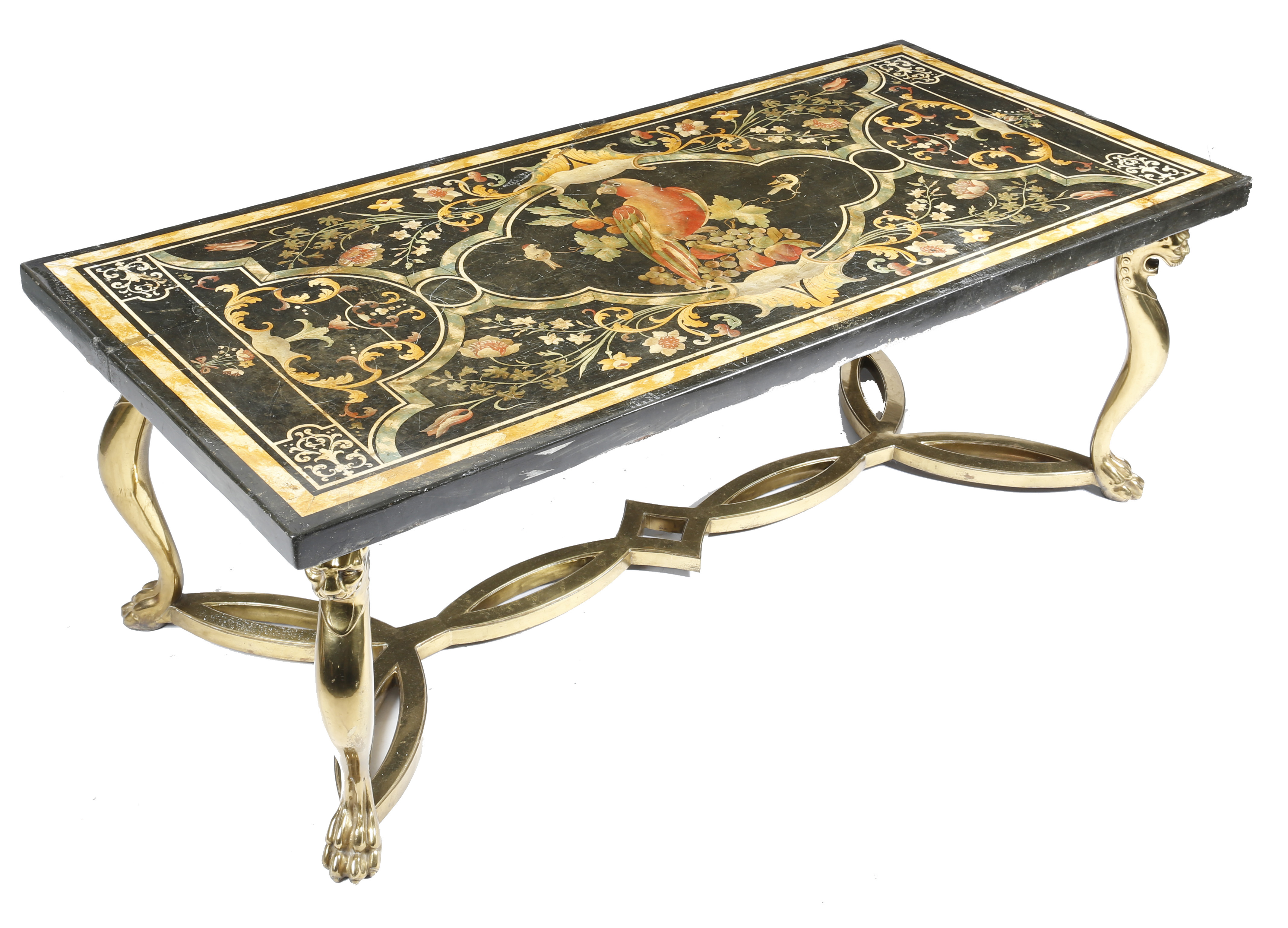 An Italian Florentine Grand Tour scagliola table top, decorated with a central cartouche with a colourful parrot perched on fruit, flanked by two further birds, with scrolling leaves and flowers, 19th century, on a later associated gilt brass base on leopard monopodia support united by a pierced stretcher, 52.7cm high, 68cm wide, 143.6cm deep.