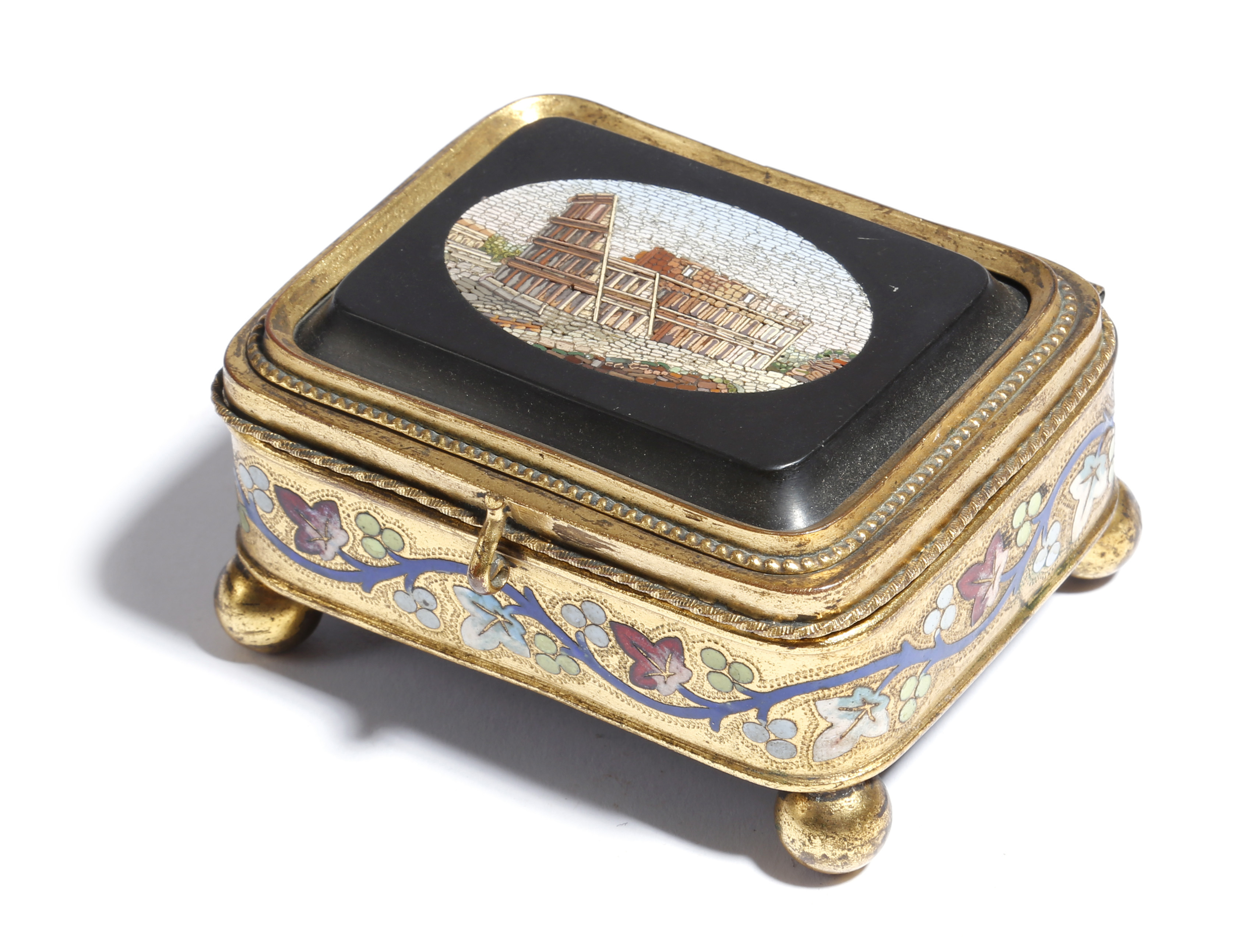 A late 19th century Italian micromosaic and gilt metal Grand Tour casket, the lid inlaid with the view of the Colosseum, the silk lined interior inscribed 'C. Roccheggiani Roma', the body decorated with an enamel grapevine, 8.6cm wide.