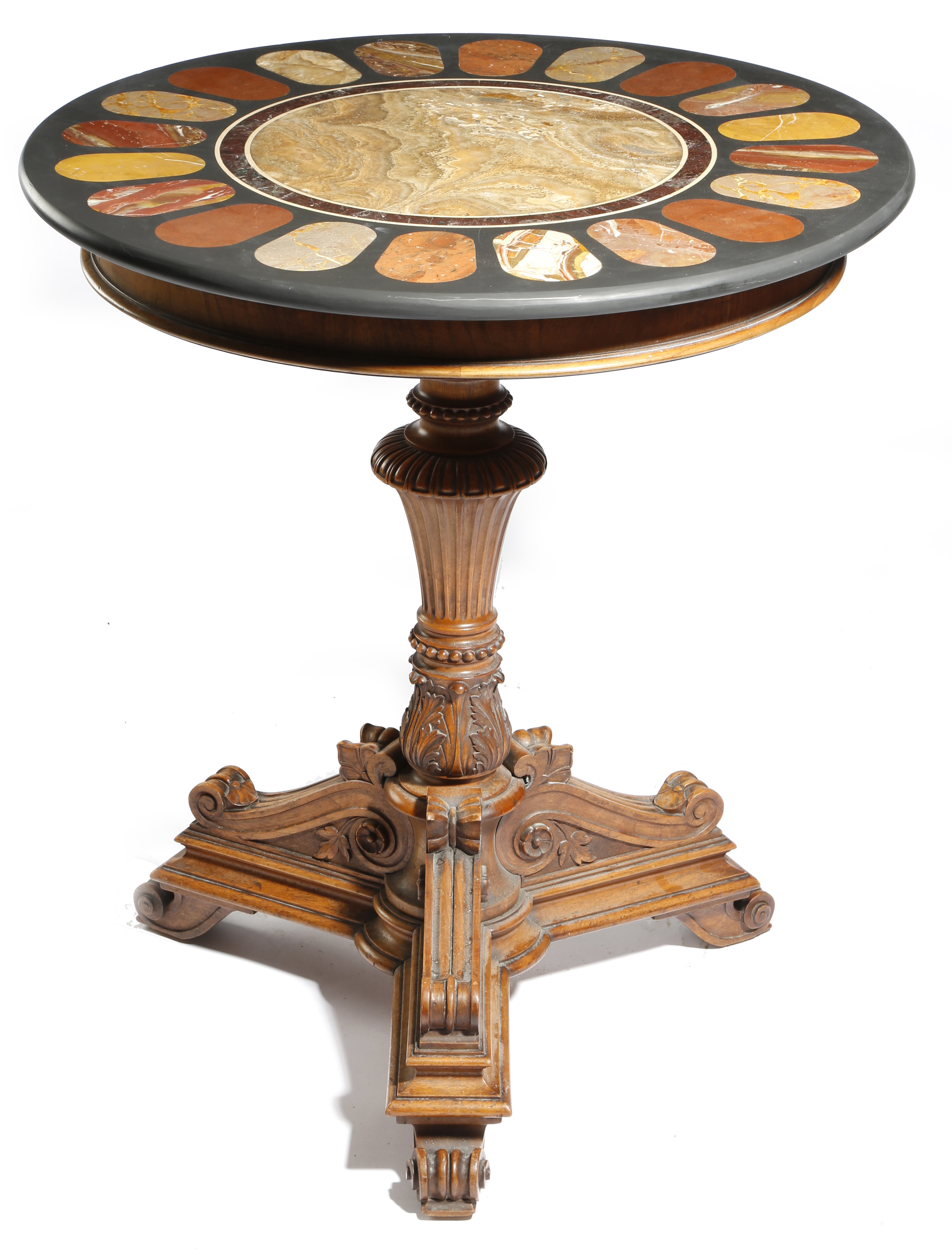 A late 19th century Italian pietra dura and walnut centre table, the circular tilt-top inlaid with various marble and hard stone specimens, the centre with a circular alabaster panel, on a fluted and leaf carved stem and a triform base with scroll feet, 77.3cm high, 68.7cm diameter.