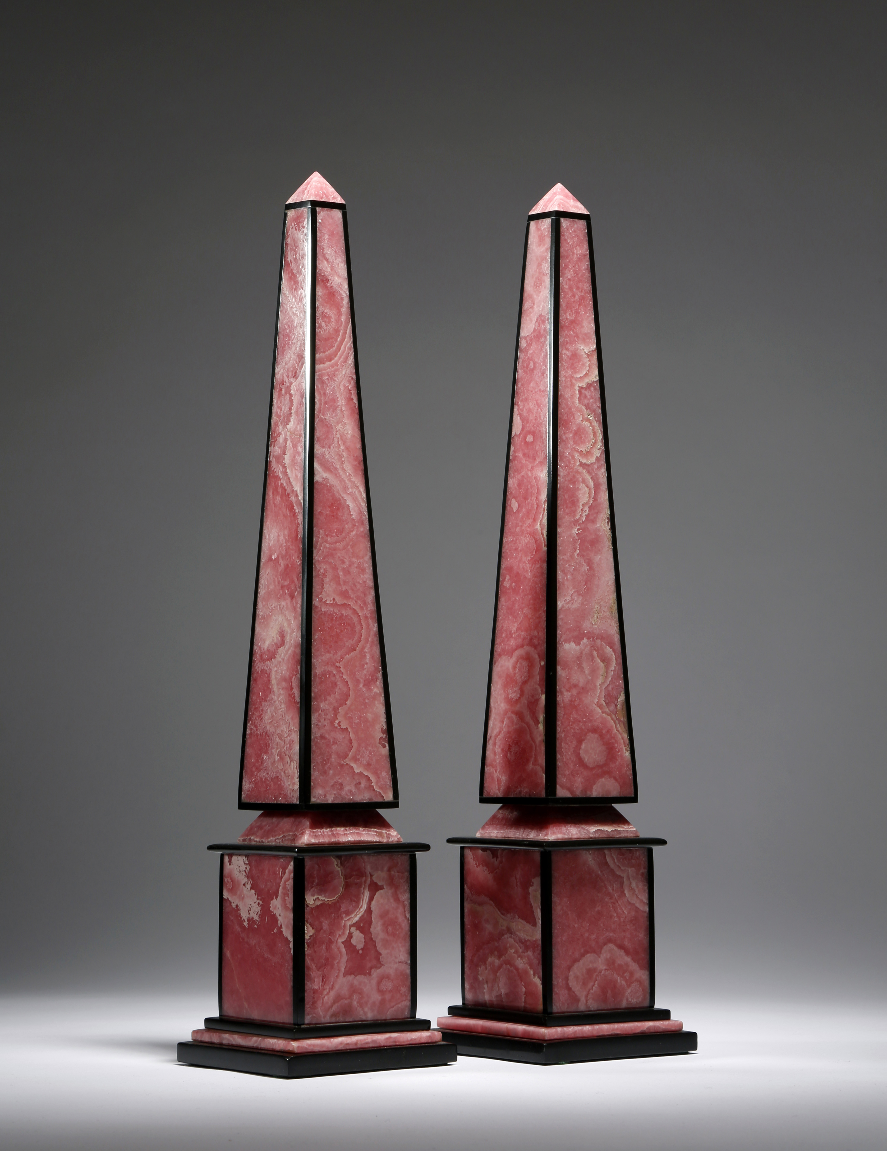 A rare pair of Argentinian pink rhodochrosite and black marble obelisks