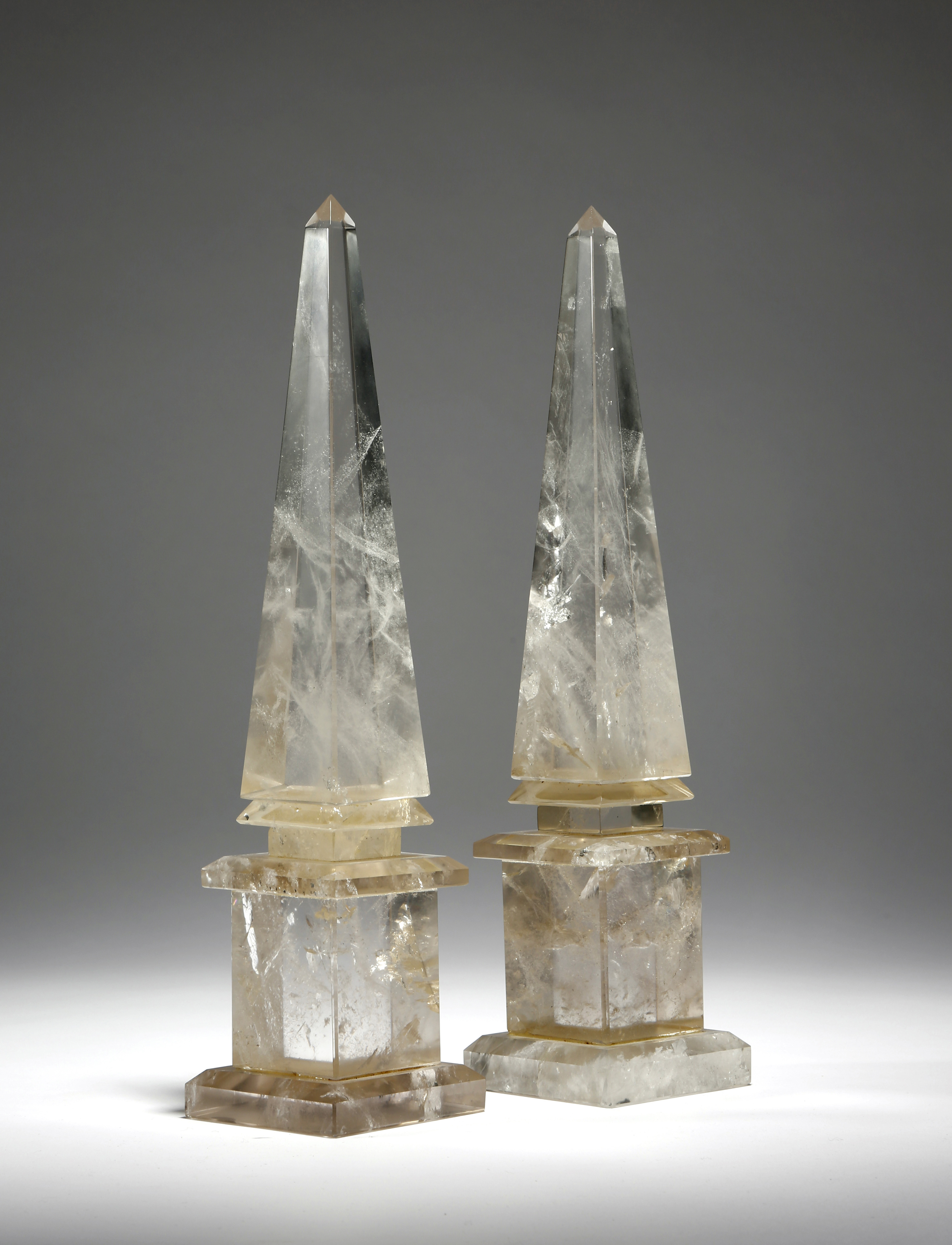 A pair of rock crystal obelisks, with tapering stems on stepped plinths, each with a printed label, inscribed 'ART PETRUS', late 20th century, 33.5cm high. (2)