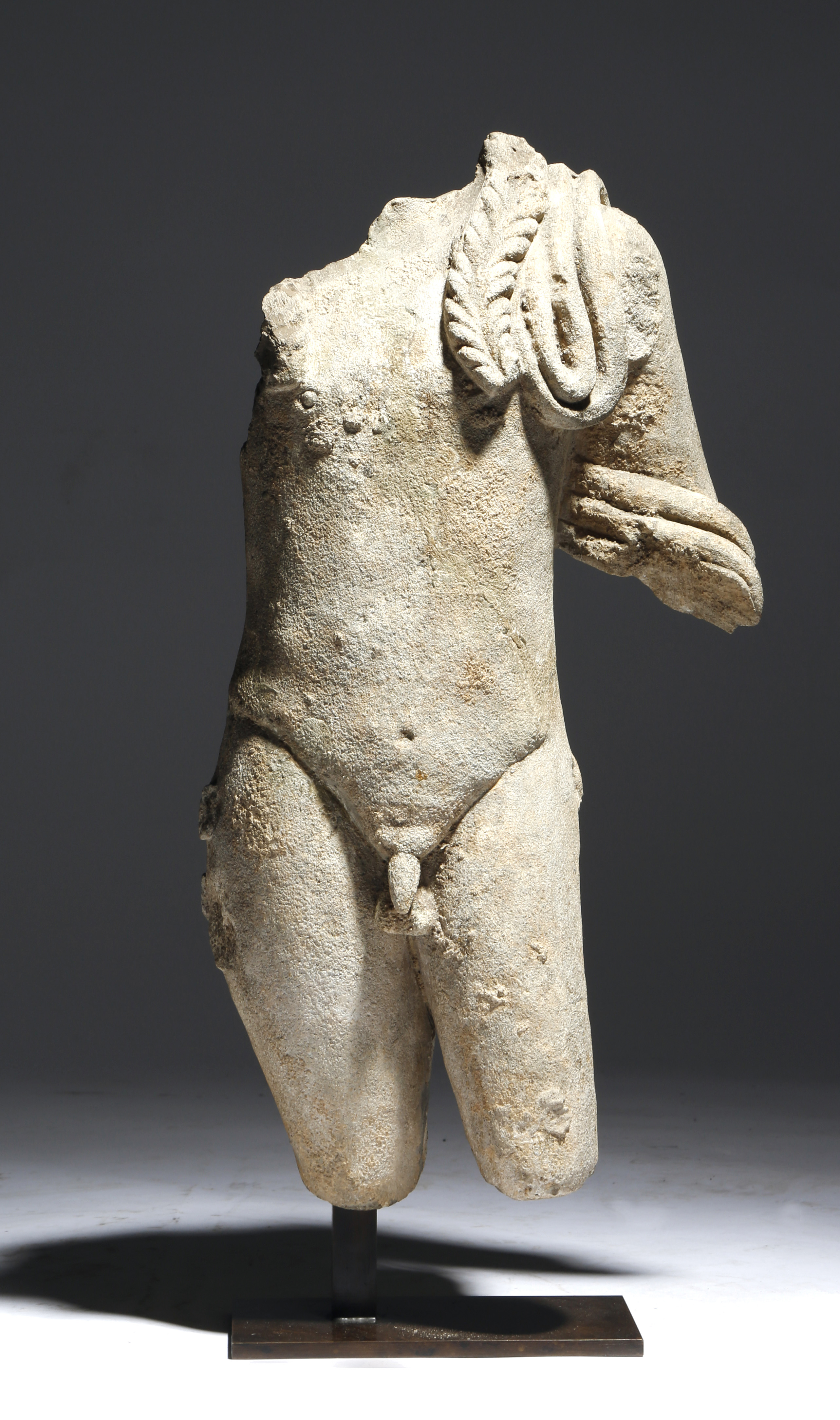 A Romano-Egyptian limestone torso of Harpocrates, c.1st - 2nd century AD, the youthful god depicted nude with the plait of his sidelock over his left shoulder and with the folds of drapery over the same and his left arm, 57cm high, mounted. (2)