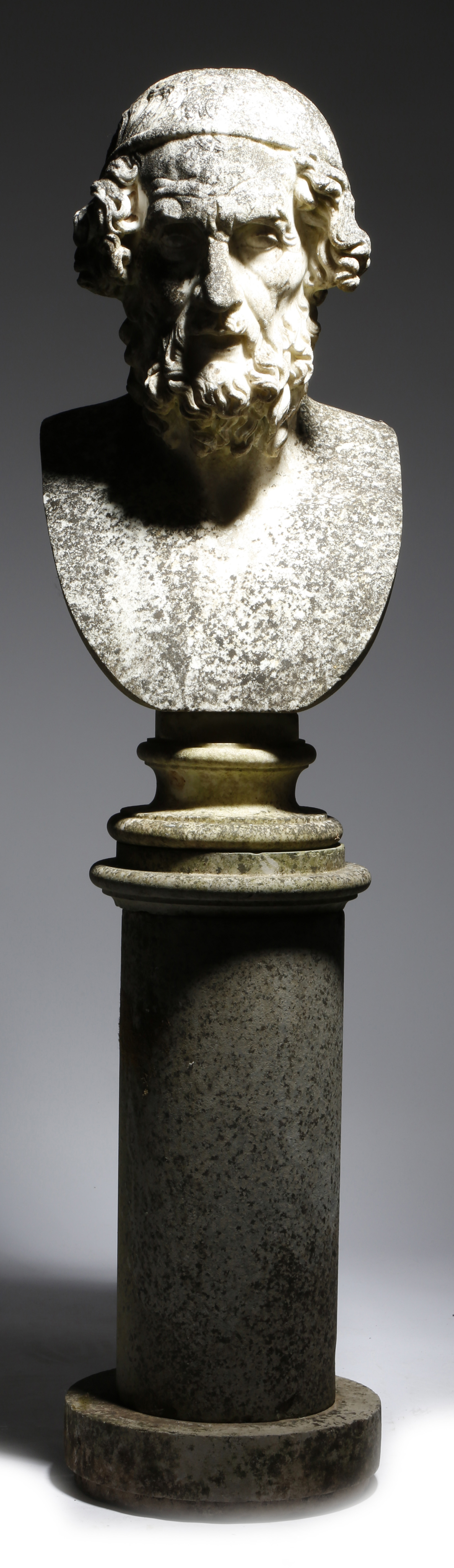 After the antique. An early 19th century Italian white marble Grand Tour bust of Homer, with a weathered patination, signed 'Franco Franchi copia in Carrara', 58cm high, on a socle and plinth base, 124.5cm high (overall).