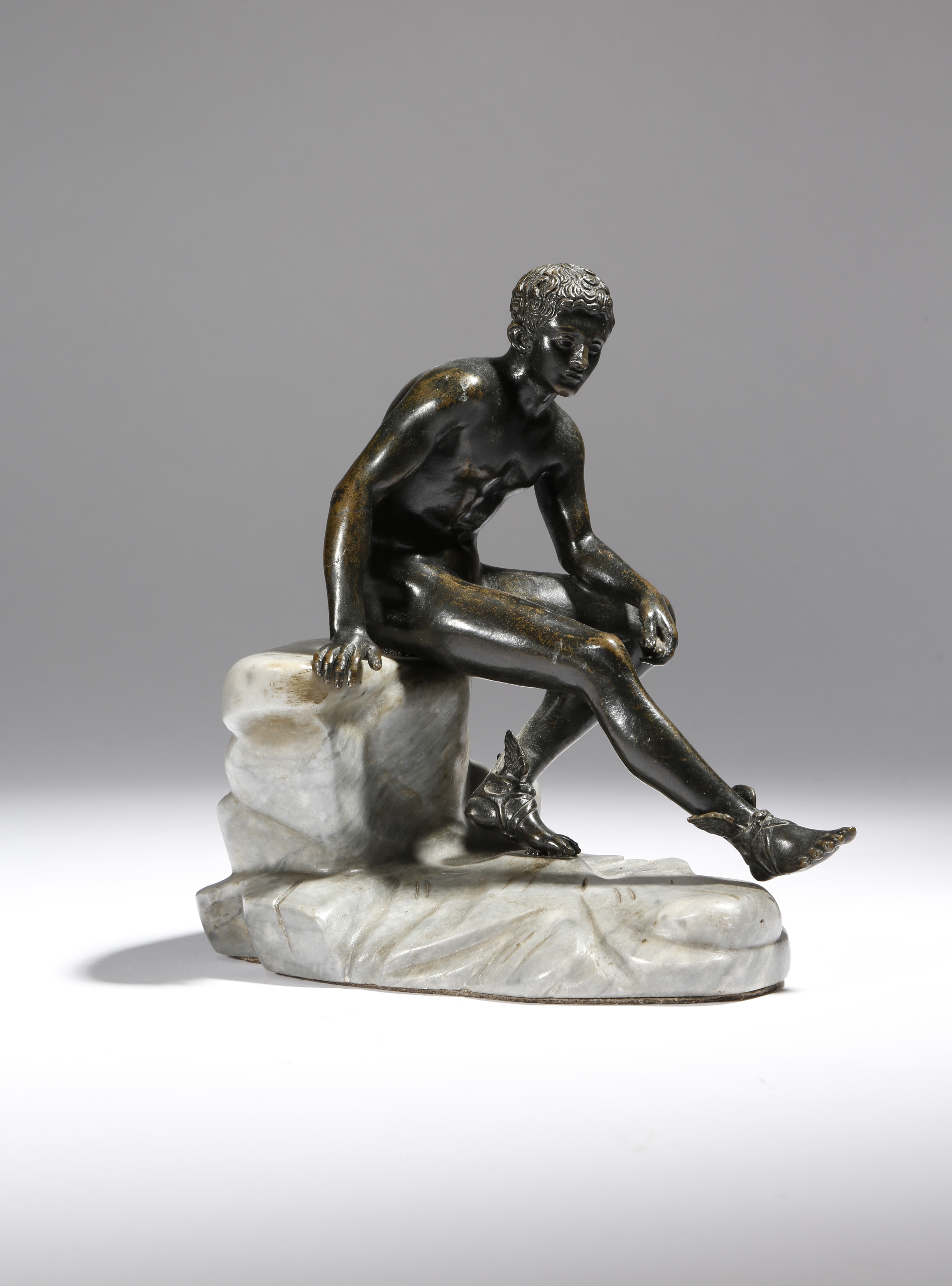 After the antique. A 19th century Italian bronze Grand Tour figure of Mercury, seated at rest on a marble rocky outcrop, 19.5cm high.