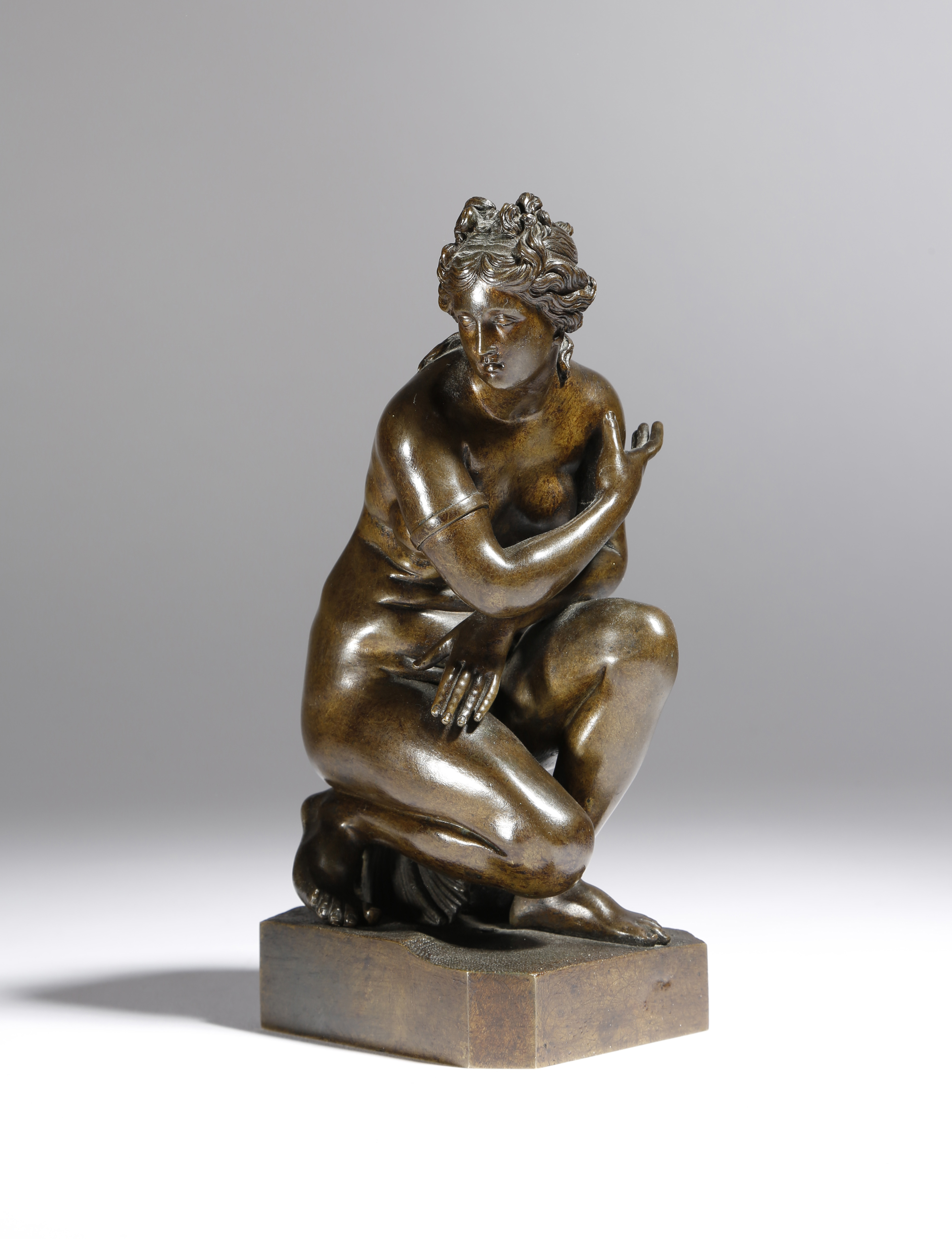 After the antique. An early 19th century Italian bronze Grand Tour model of the 'Crouching Venus', kneeling on a shell, 21.5cm high.