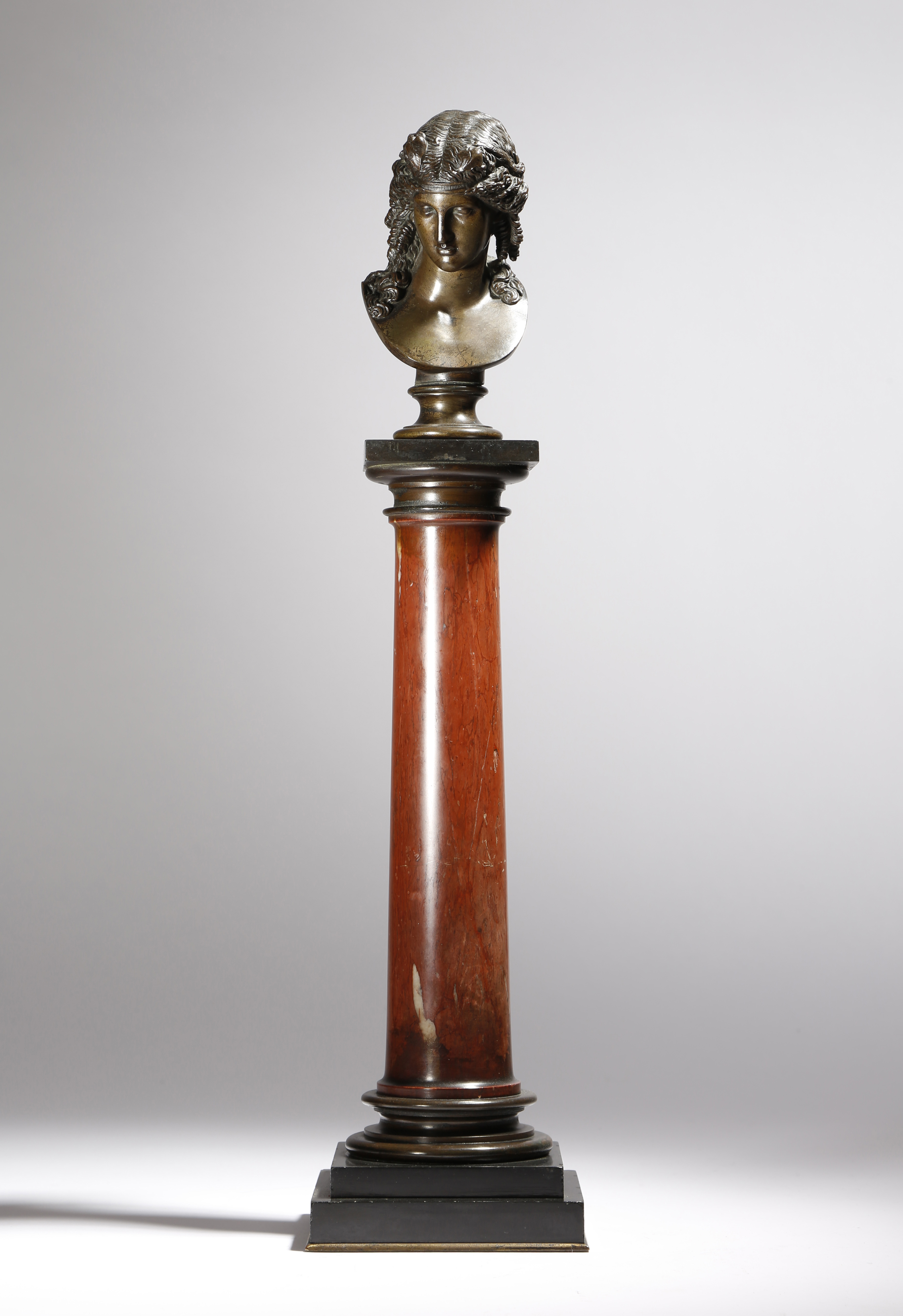 After the antique. A mid-19th century French bronze Grand Tour bust of Ariadne, stamped 'G S' for Georges Emile Henri Servant (French 1828-1890), on a turned socle and a bronze and rosso antico marble column, 48.9cm high.