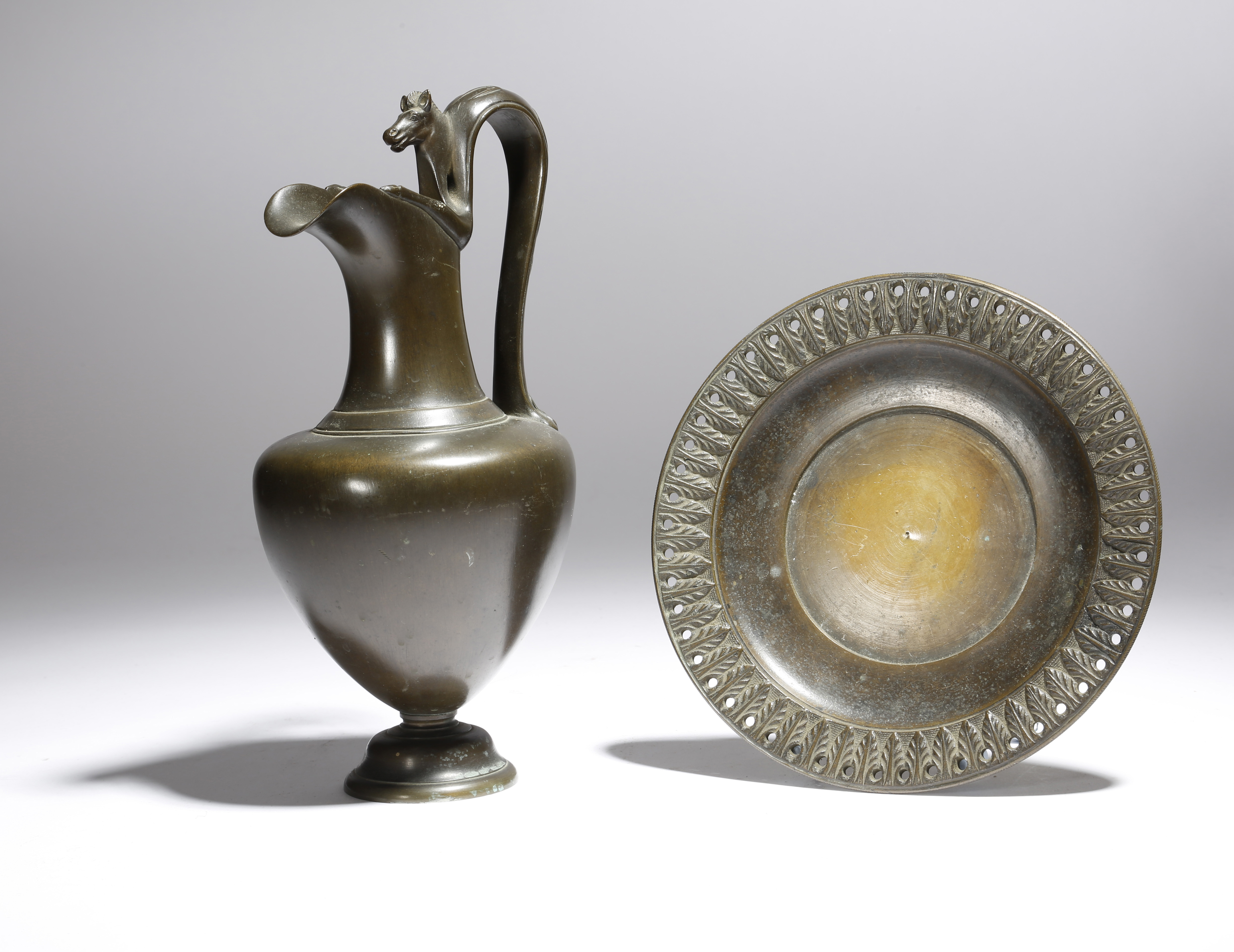 A 19th century Italian bronze Grand Tour ewer, the handle formed as a hippocampus, with a trident tail and a male mask terminal, 23.9cm high, together with a bronze plate, with a pierced stiff leaf border. (2)