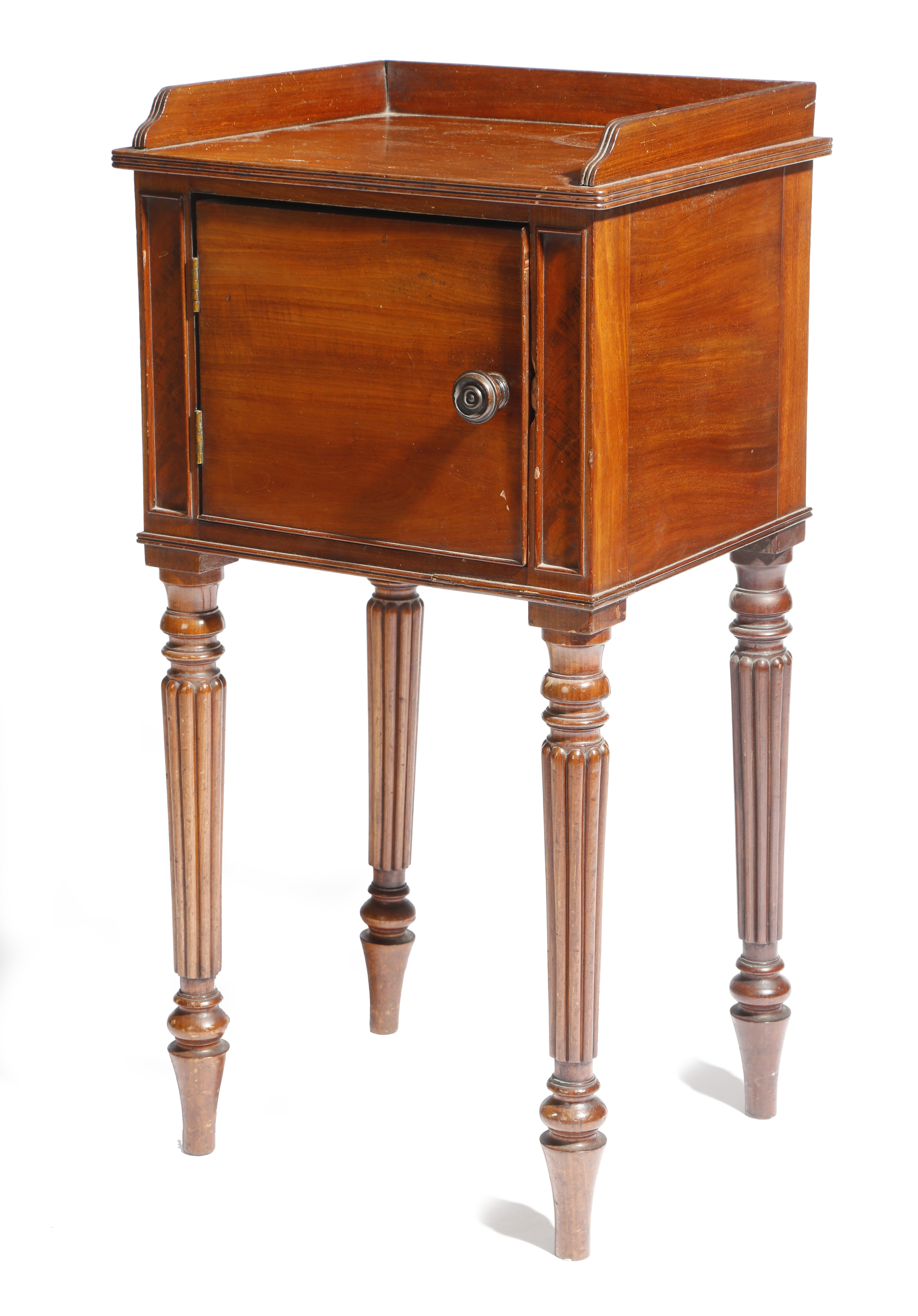 λ A George IV mahogany bedside cupboard attributed to Gillows, with a reeded three quarter gallery above a cupboard door with a turned rosewood handle, flanked by a pair of flame veneered tablet panels with outline mouldings, on turned and ribbed legs, 80.3cm high, 40cm wide, 35cm deep.